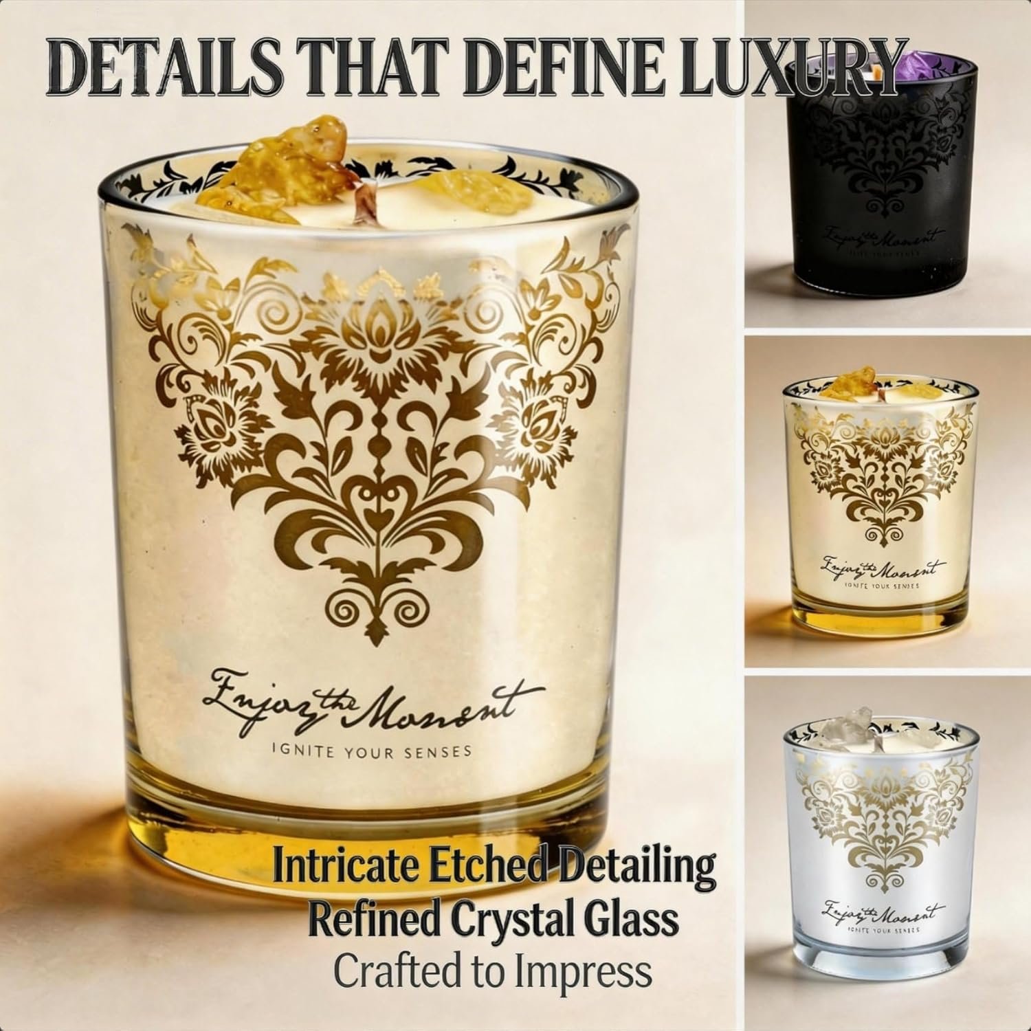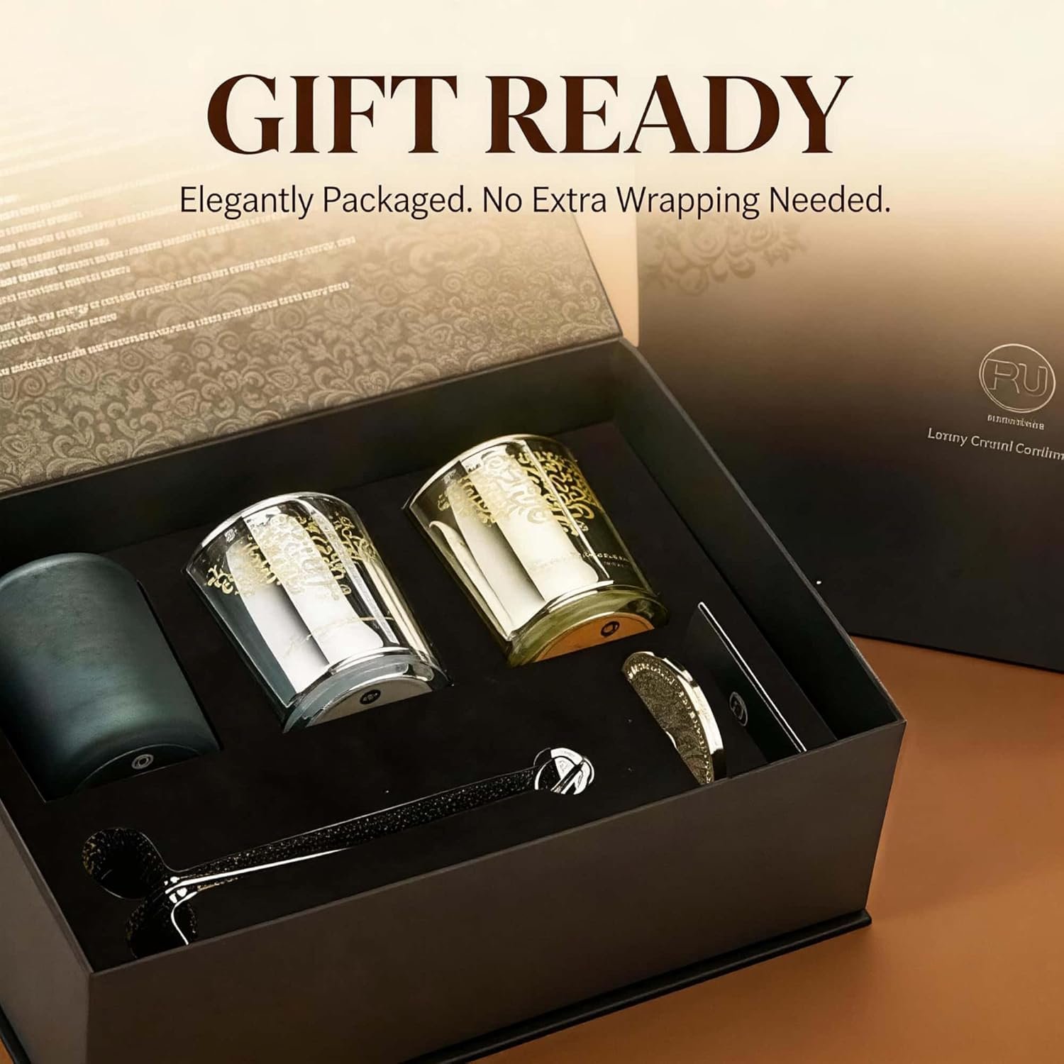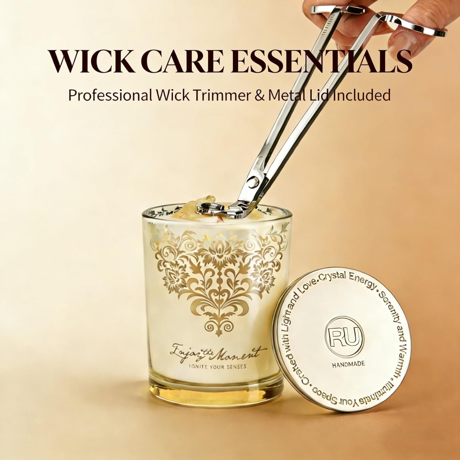 3️⃣ COMPLETE CANDLE CARE SET INCLUDED Includes a stainless steel wick trimmer and engraved snuffer lid to help extend candle life, reduce smoke, and maintain a steady flame. A true luxury candle gift set with tools included.