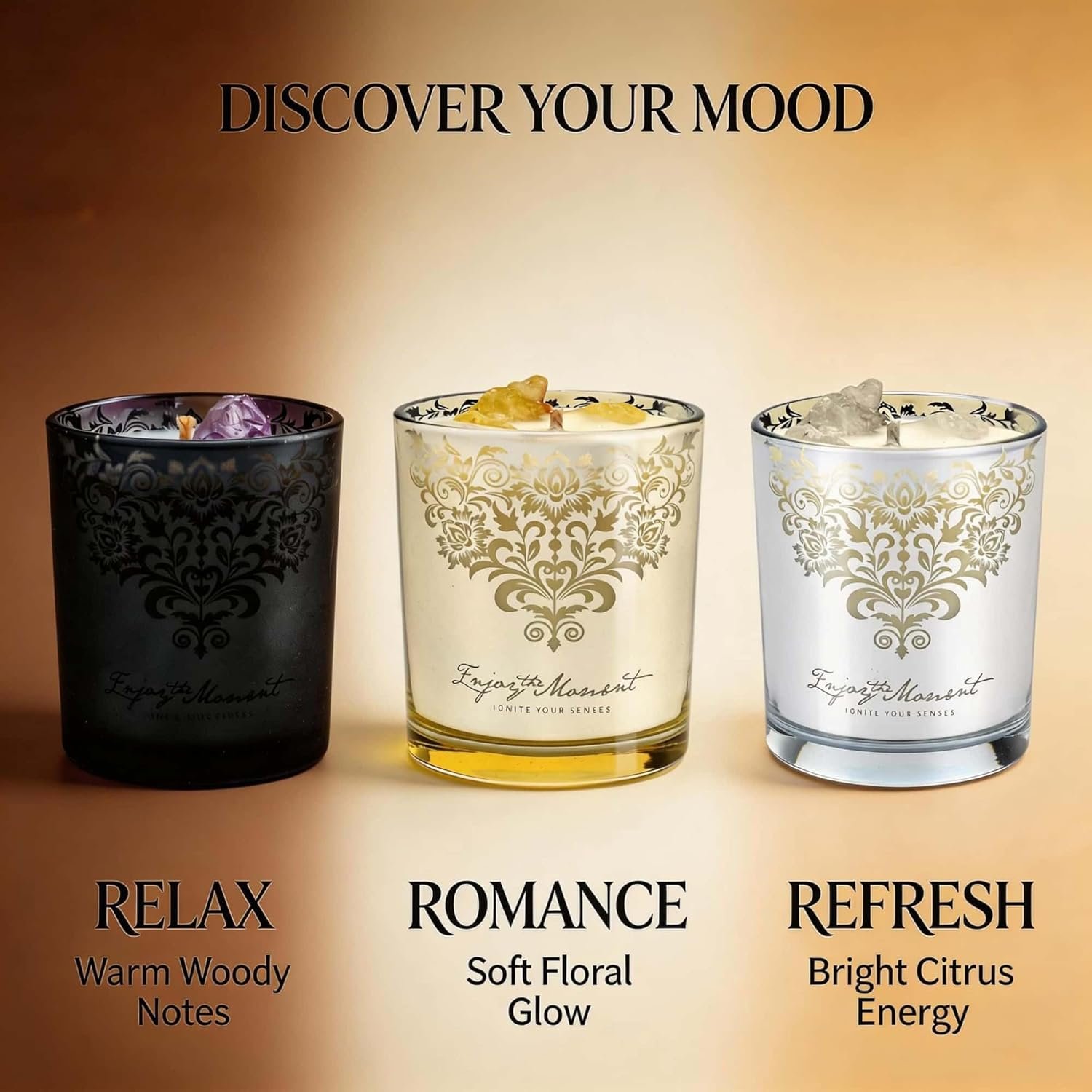 4️⃣ THREE SIGNATURE SCENTS – WOODY, FLORAL & CITRUS Forest Reverie (Woody) Moonlit Garden (Floral) Citrus Sunrise (Fresh Citrus) A balanced combination of warm, romantic, and uplifting aromas designed for relaxation, mood enhancement, and home ambiance.
