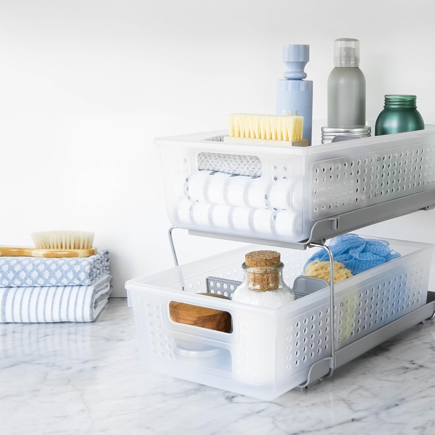 SPACE-SAVING DESIGN: Features 2 removable baskets for easy access to your essentials, and both baskets have 2 adjustable dividers to help further separate your items for easy custom organization