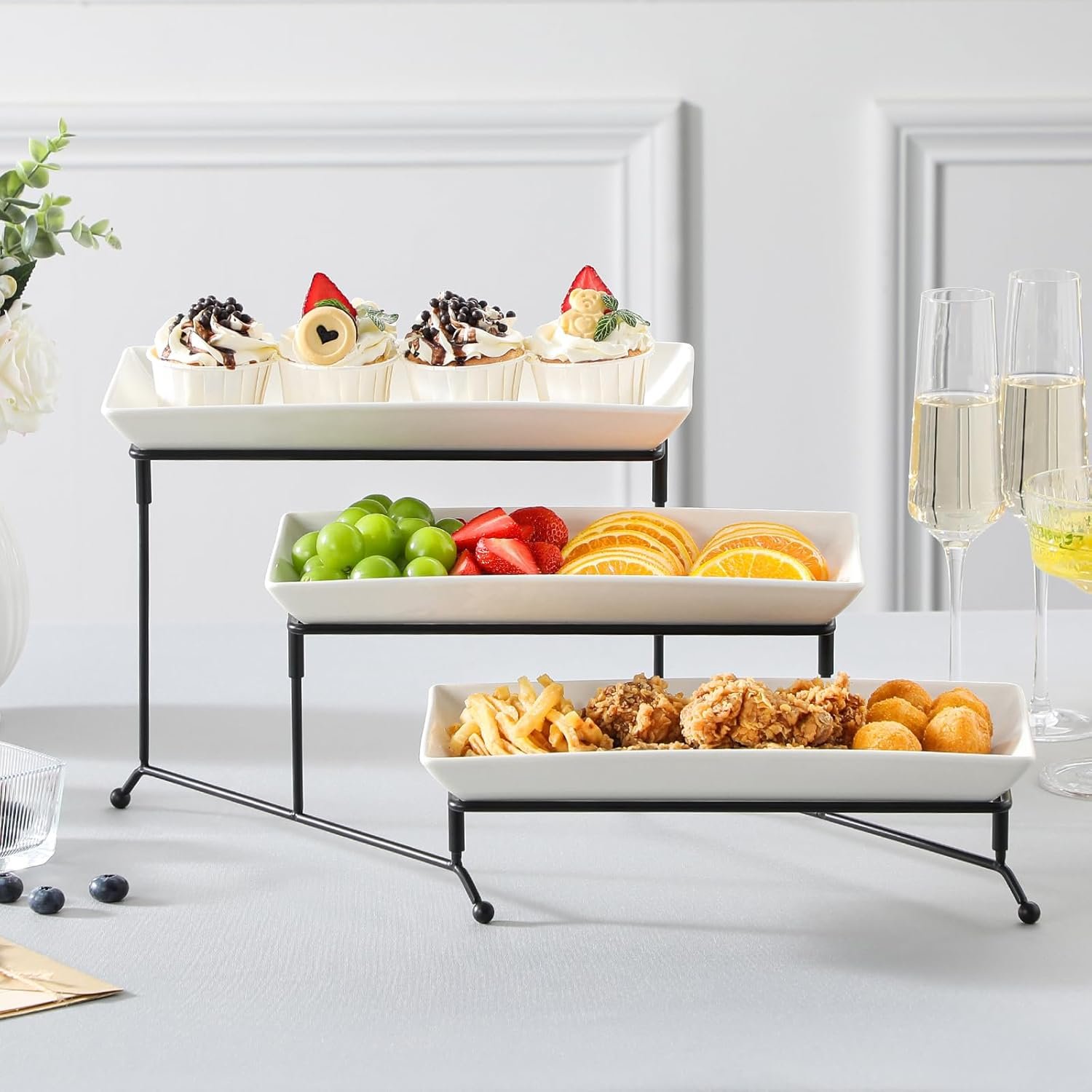 Sturdy and Stable: Our 12-inch serving tray stand comes with 3 layer sturdy metal stand with three of white rectangular ceramics trays, providing ample space to elegantly present your food and desserts, The black metal rack is robust, and stable,foldable, allowing to flexibly adjust angles and convenient access to food. Our tiered platter stands firm while holding your favorite delicacies. Whether it’s delicate pastries or savory bites, rest assured the serving stand will make your display secure and eye-catching.