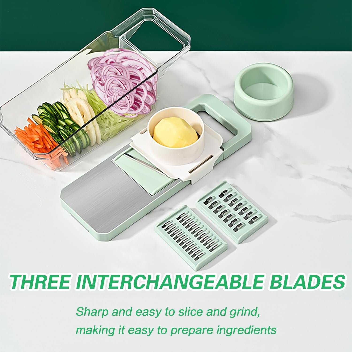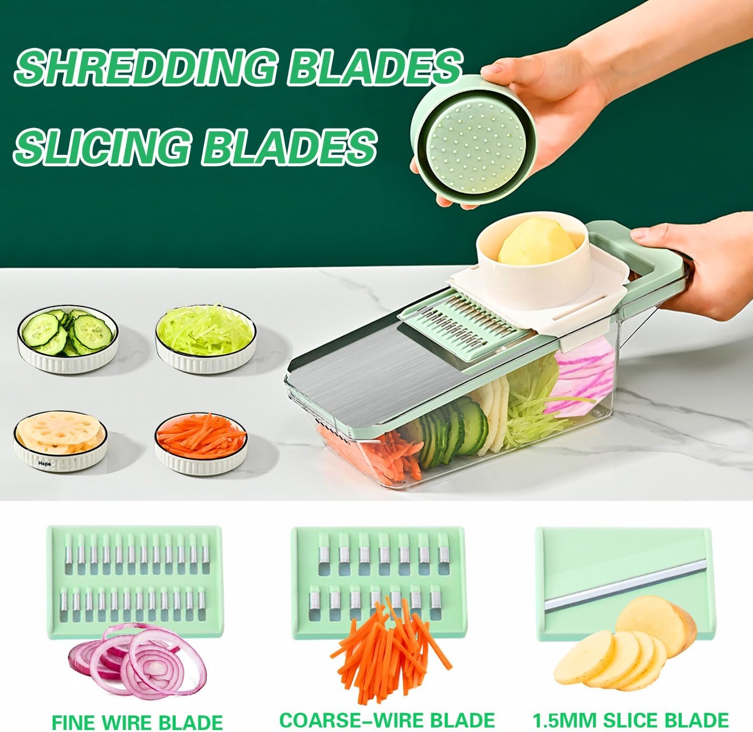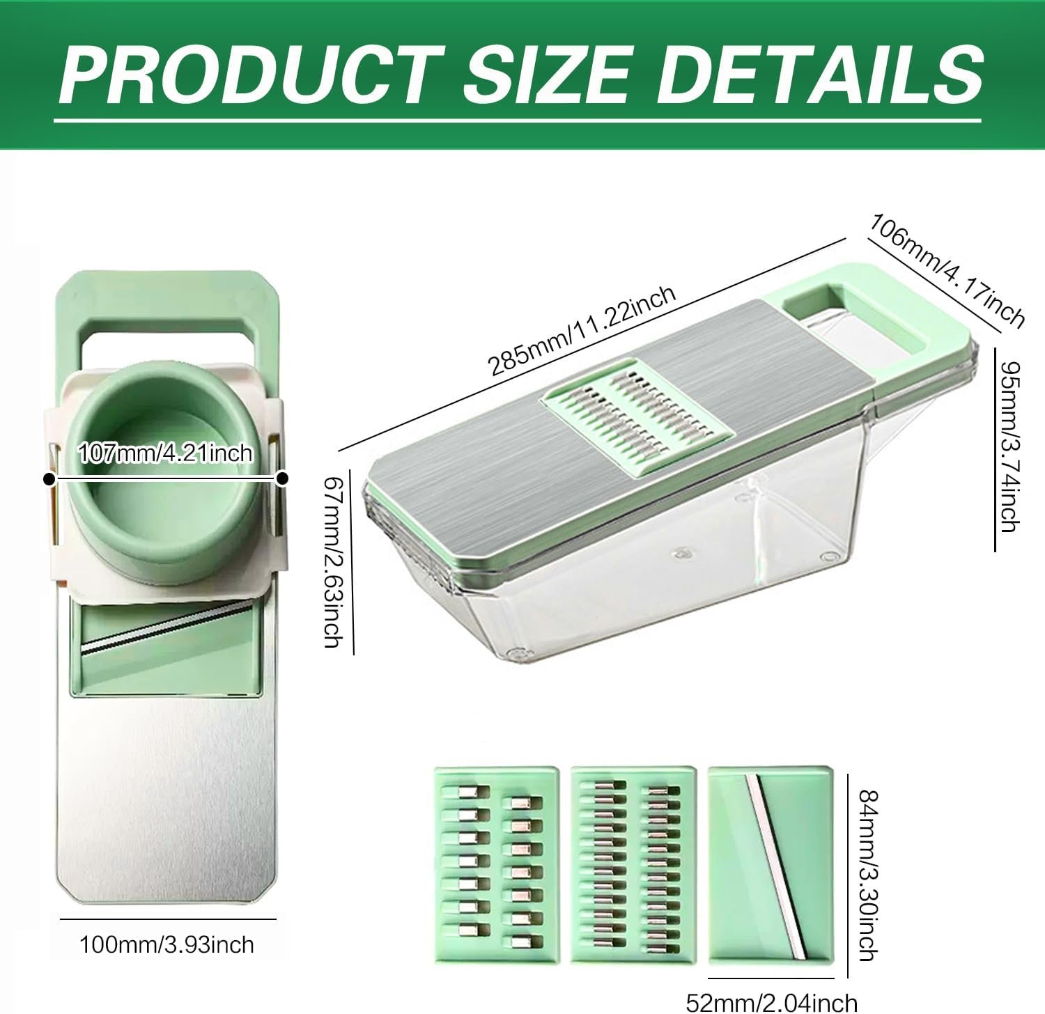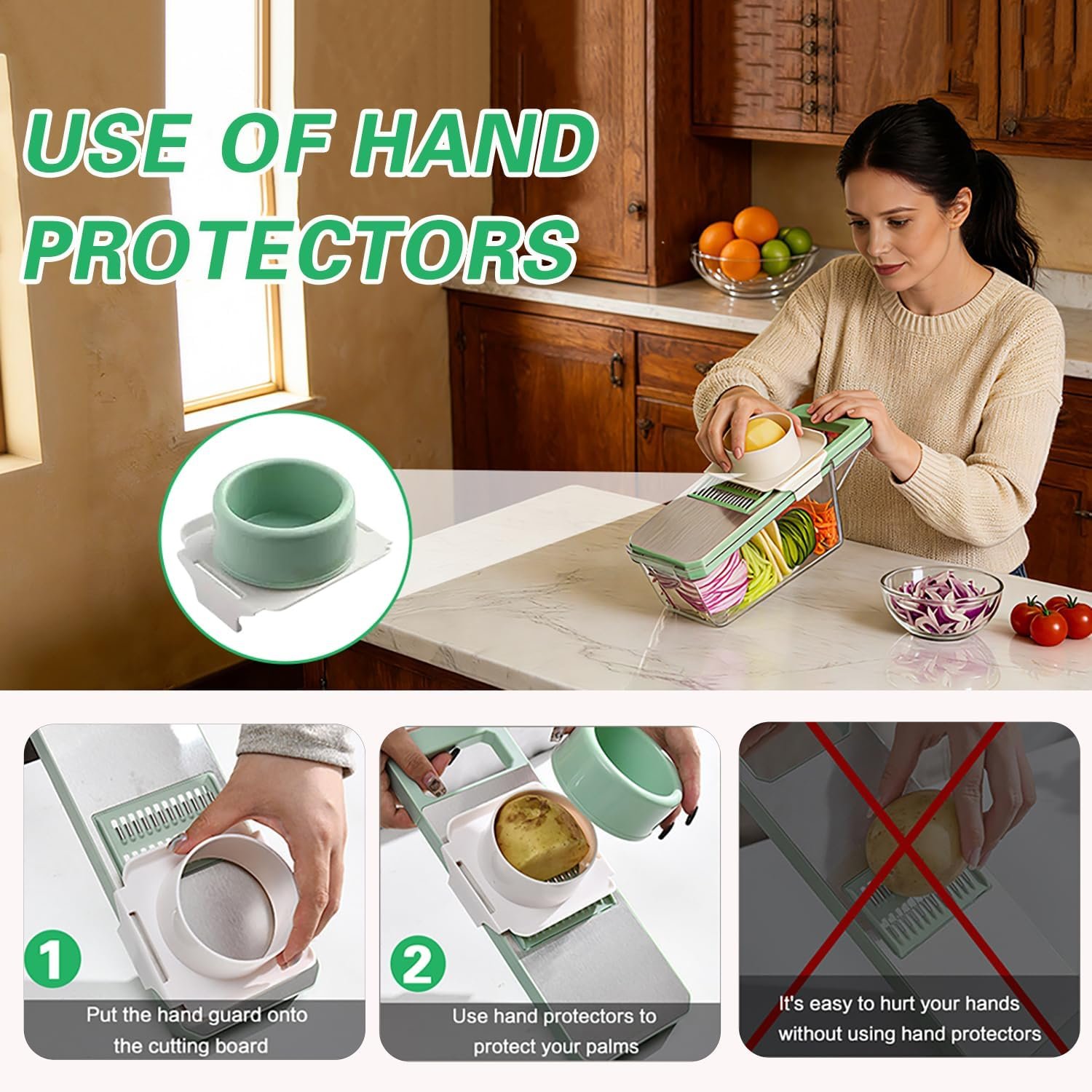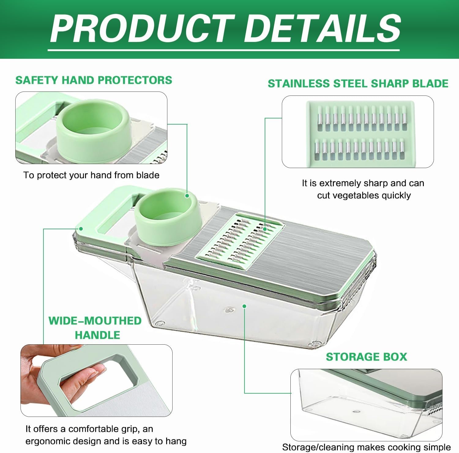2 reviews for Mandolin Slicer For Kitchen Food,Hand Safe Veggie Chopper with Container and Lid, Dicer, Slicer,3 Mandoline Blades Vegetable Cutter For Onion,Potato,Carrot,Essential Kitchen Gadgets-(6 in 1, Green),