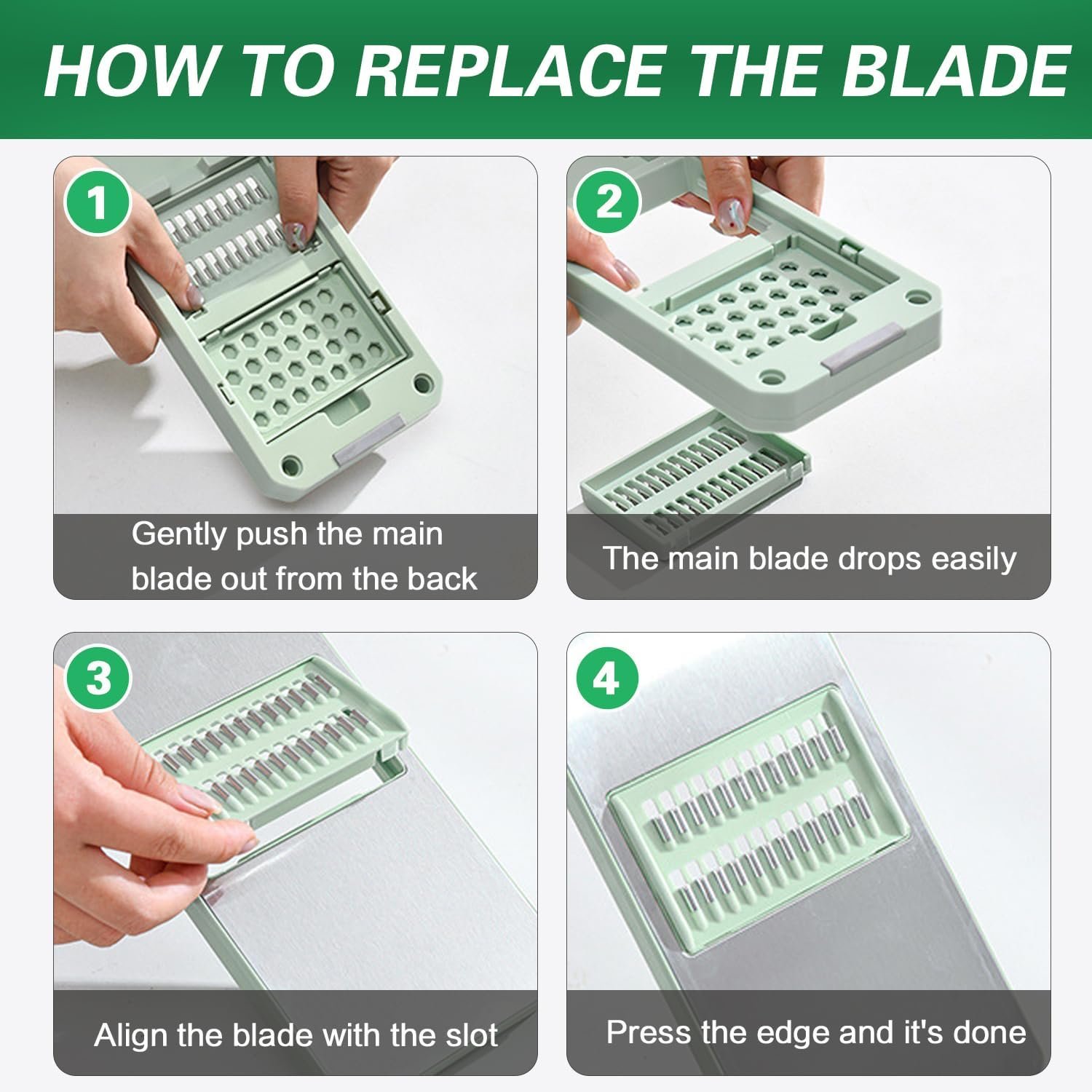 【3 Interchangeable Blades】: This food chopper and dicer includes 3 precision stainless-steel blades for slicing, grating, julienne, and dicing. Each blade locks in securely for consistent cuts—perfect for onions, potatoes, fruits, and vegetables of all kinds.