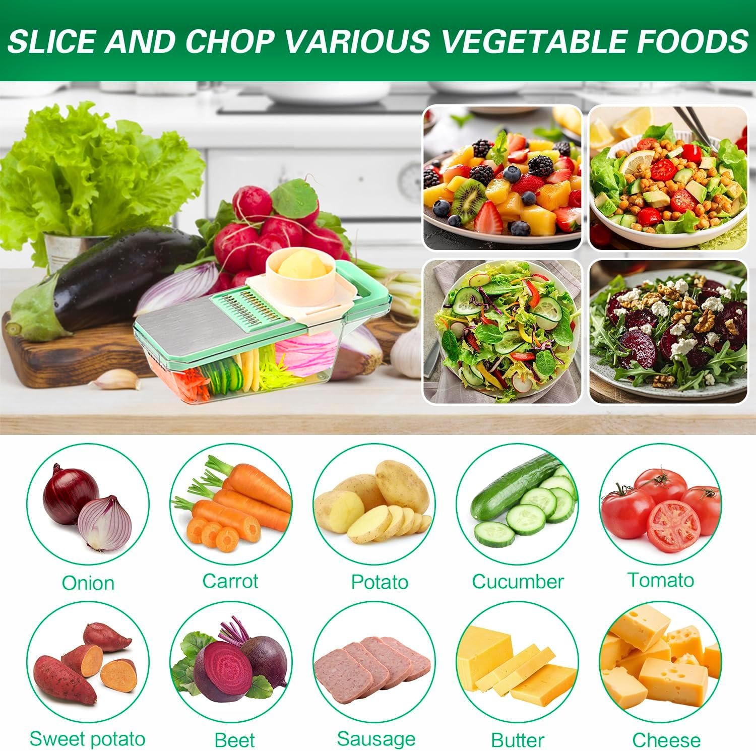 【Easy to Clean & Store】: Detachable parts make this vegetable slicer and chopper simple to rinse or place in the dishwasher. Its compact design and built-in container save space, keeping blades organized and ready for quick everyday cooking.