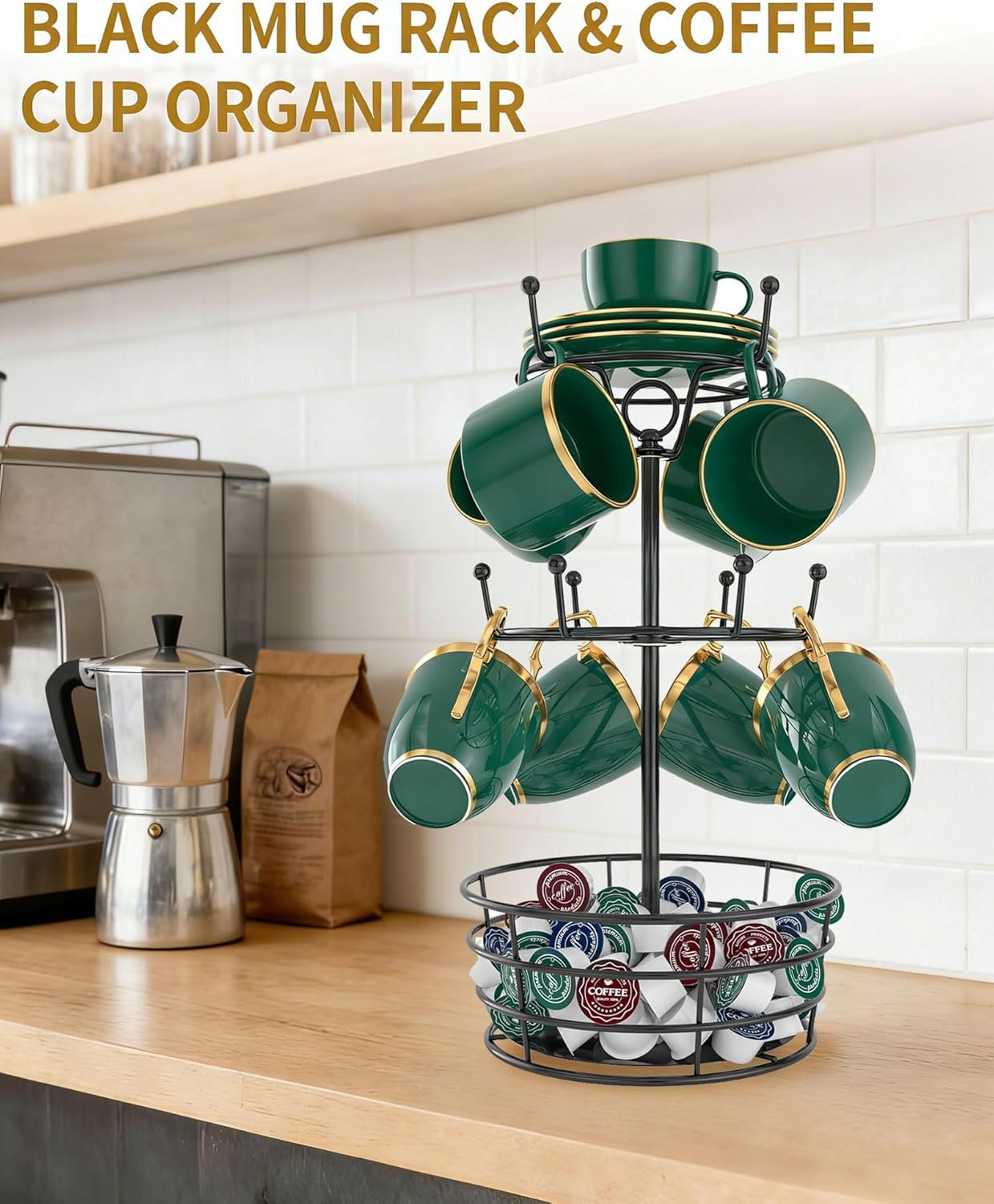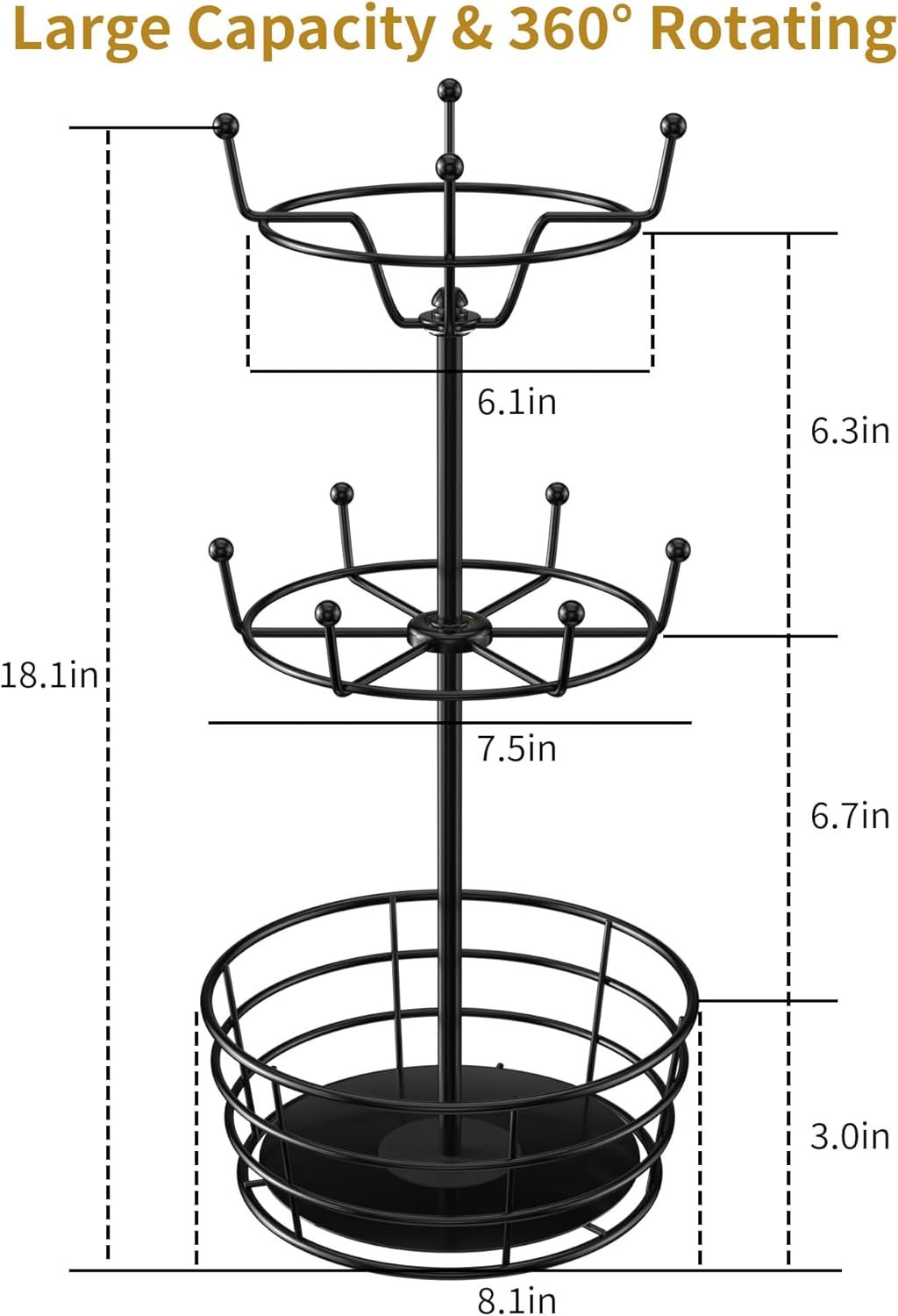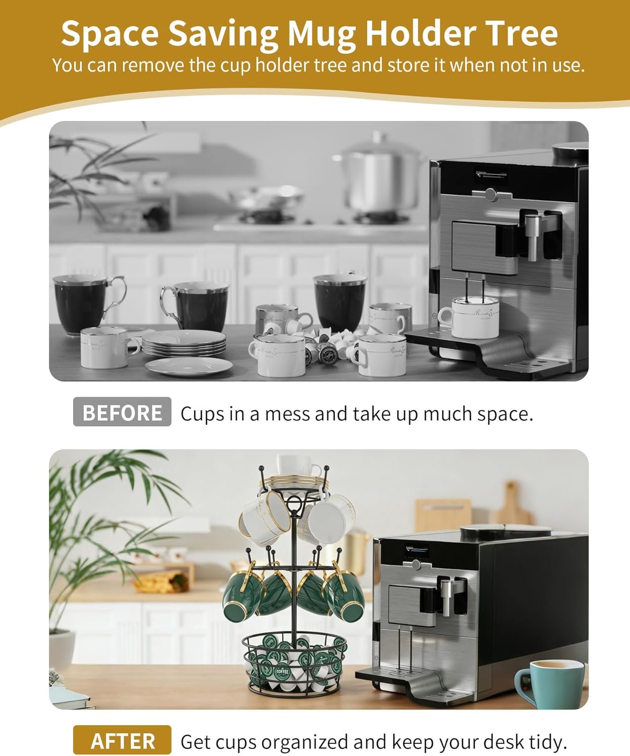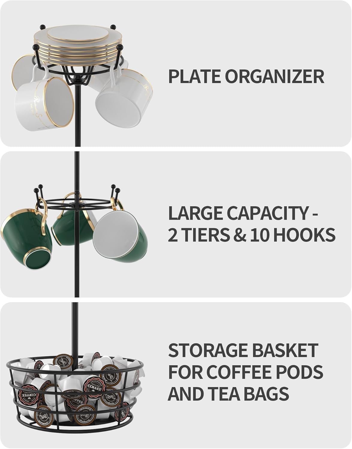 360° ROTATING CONVENIENCE – With a simple twist, you can effortlessly spin the coffee mug rack to grab your mug from any angle. Additionally, there is a storage shelf at the bottom for your coffee pods, tea bags, sugar, and other small essentials!