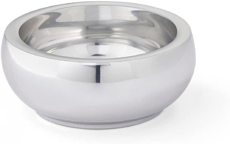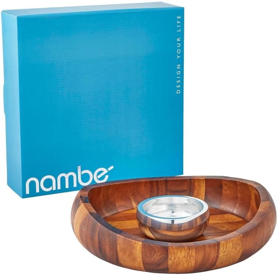 Care and Dimensions: Hand wash with warm soap and water, dry immediately with soft cloth. The serving tray measures 16″ D, and the dip bowl measures 5.5″ D. Made of Nambé Alloy and Acacia Wood.