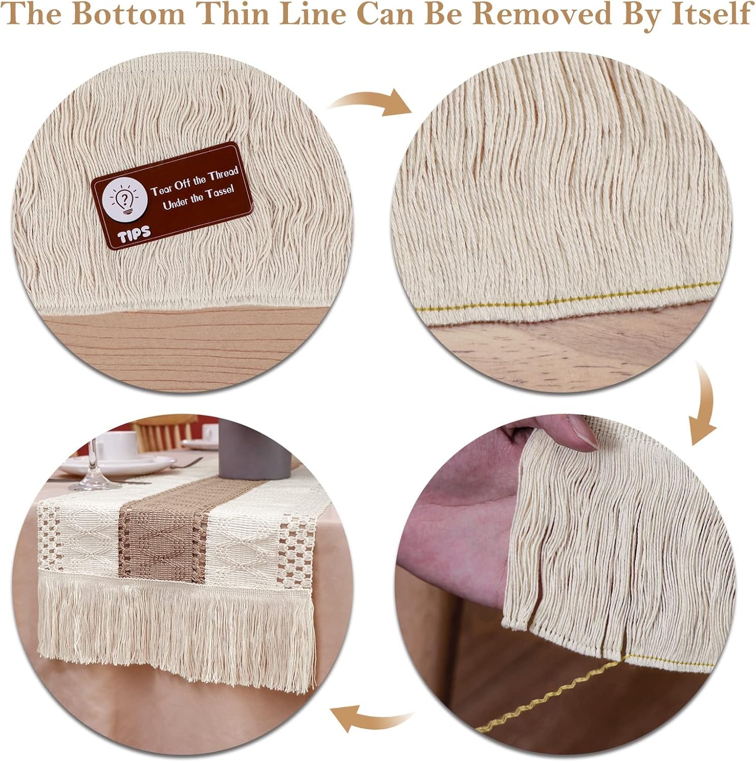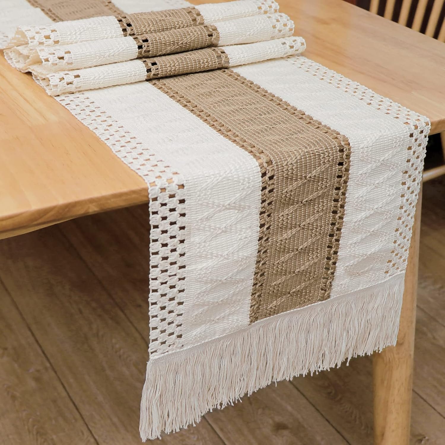 – SPLICING DESIGN: Delicate weaved hollow striped cotton fabric and woven burlap with tassel, giving a minimalist feel and creating a relaxed feel in the room. The bohemian style of the table runner evokes a warm and classy taste that both works harmoniously and aesthetically with any decor and furniture