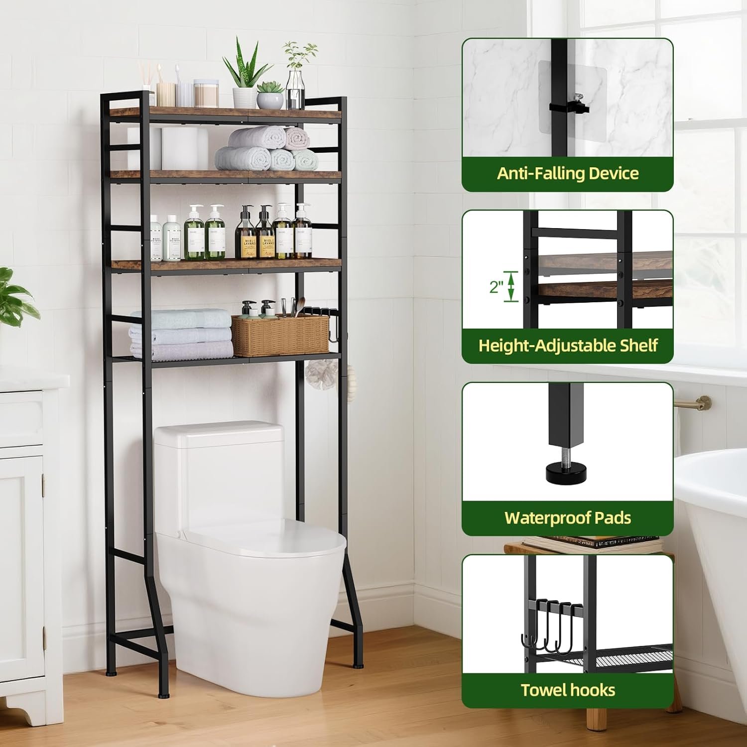 Sturdy & Stable Construction:Made of an all-carbon steel metal frame and 3 tier sturdy wooden shelves and one layer mesh wire partition, this toilet shelf is super solid and durable for daily use. It also comes with 4 retaining straps to prevent shaking and ensure safety, plus 4 non-slip feet that maintain overall stability and protect your floor from scratches