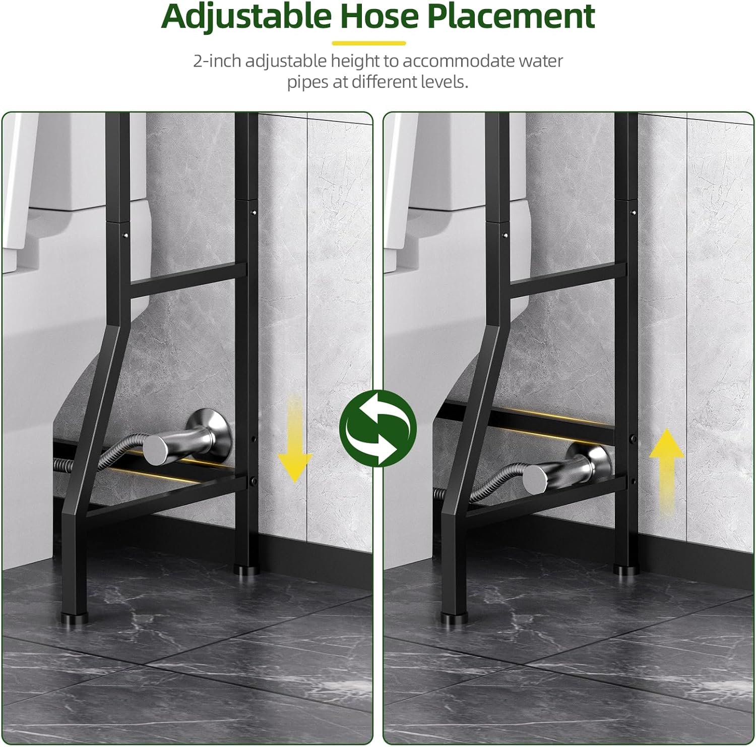 Fixed Overall Size with Flexible Adjustment:This bathroom over toilet storage rack has an overall dimension of 24.6 x 9.8 x 64.8 inches. The bottom 2 tiers and bottom support rods each offer 2 inches of adjustability, making it flexible to meet different heights of toilet lid and water inlet pipes, fitting most toilet layouts