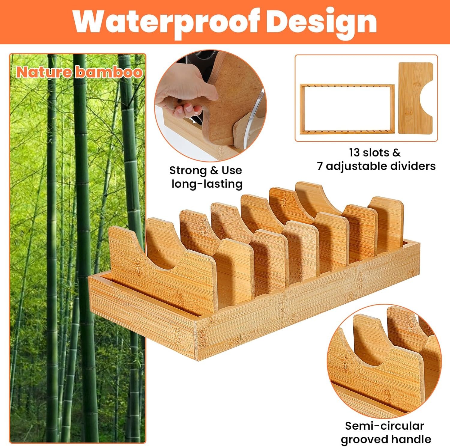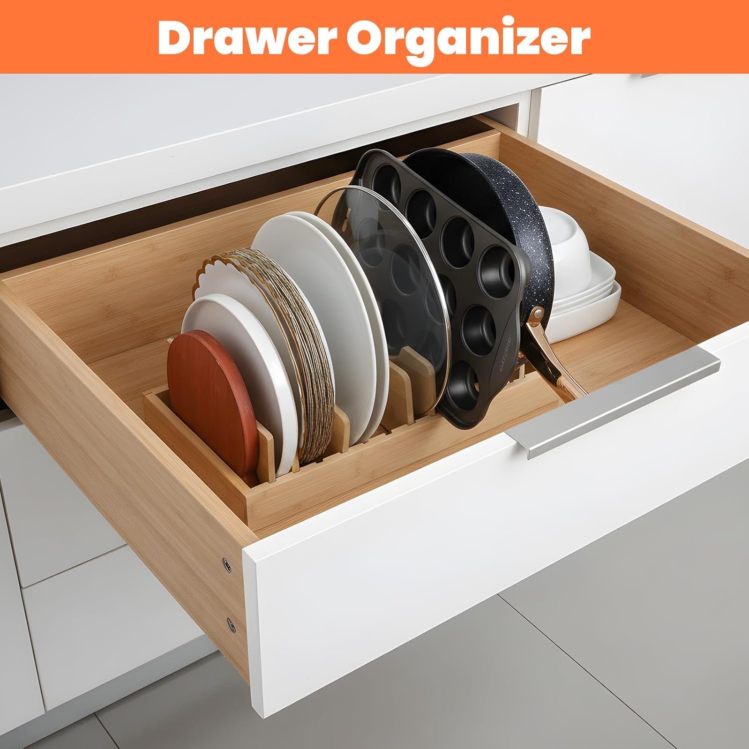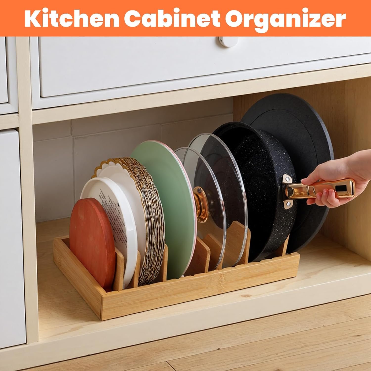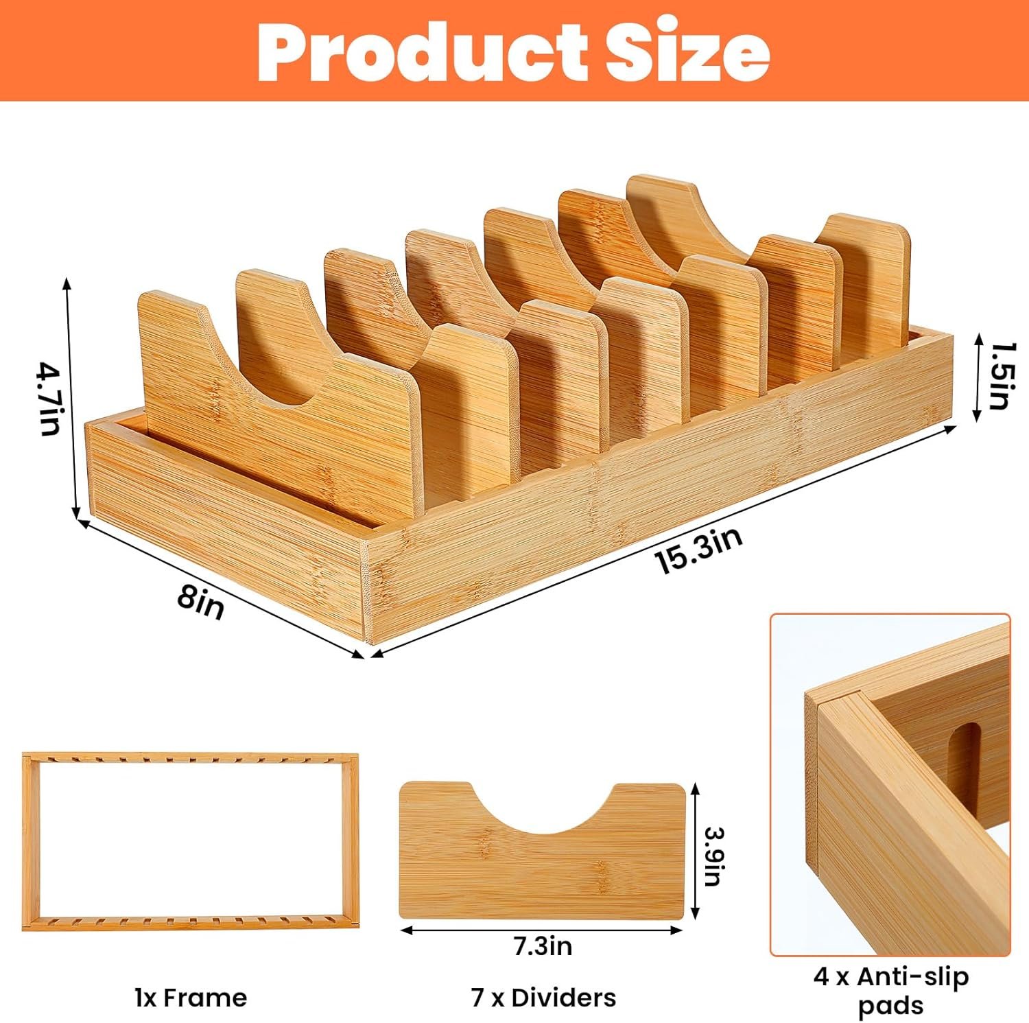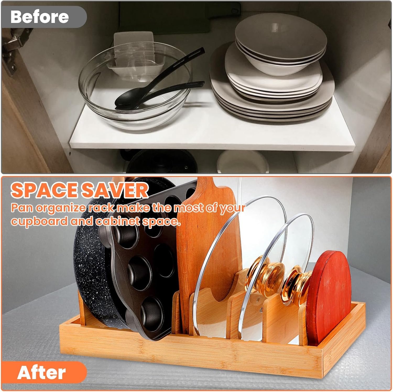Versatile Use: This wooden pot and pan organizer can store pots, pans, cutting boards, baking trays, baking sheets, frying pans, and more. It can be used in drawers, cabinets, or on countertops to neatly organize and save space