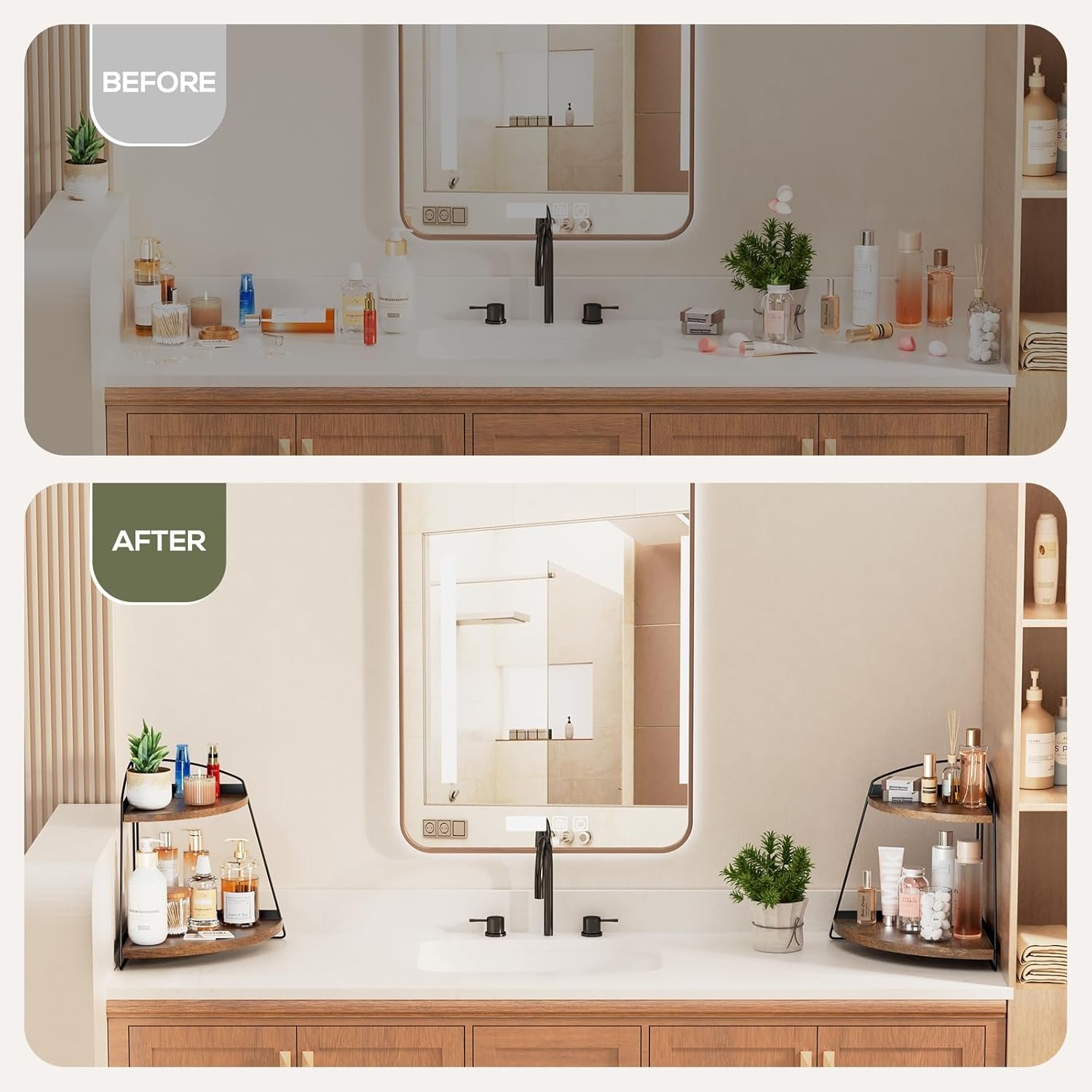 Large Capacity – Two-tiered design provides more space for your cosmetic, perfume, skincare products, and other bathroom decor or essentials, so much easier and faster to see what you have, accessing everything very easily