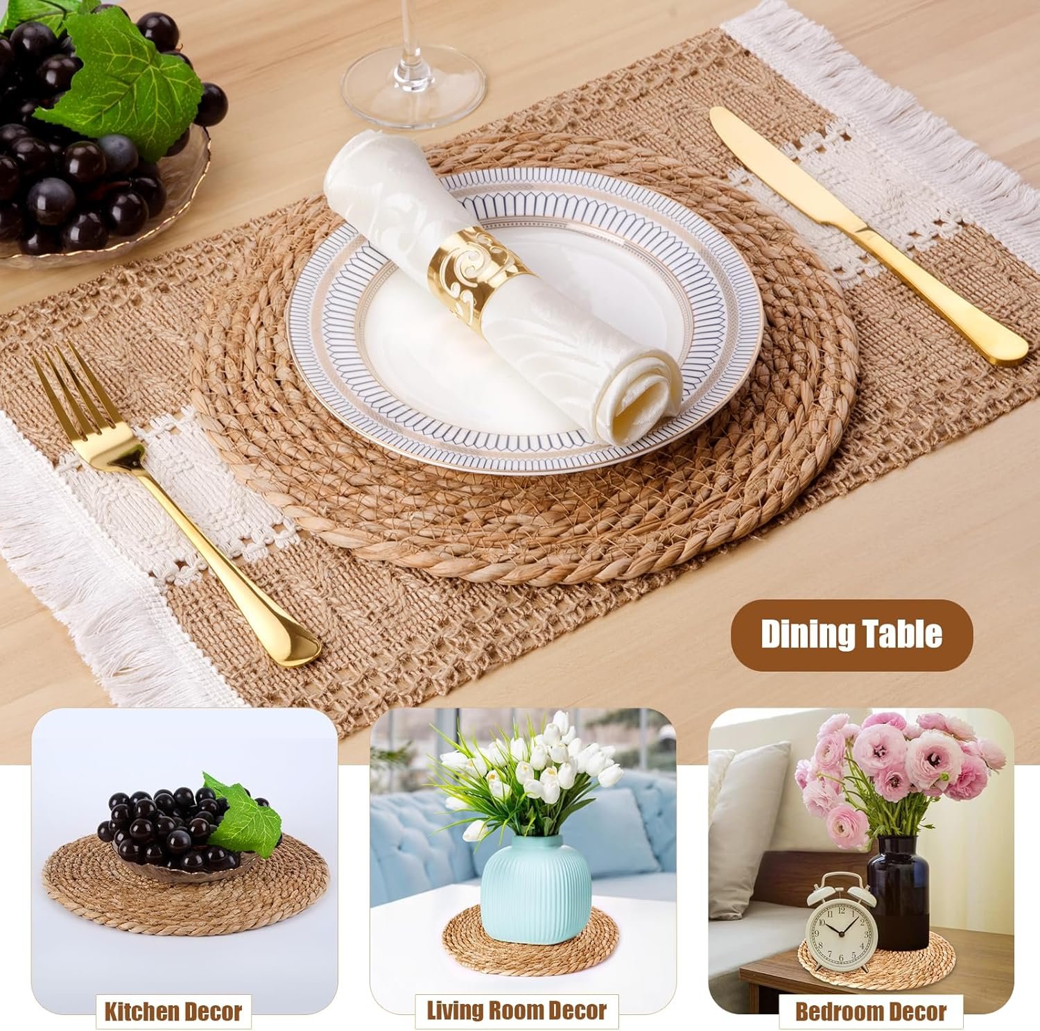 【Multi-Purpose Hand Woven Placemats Set】Our round boho placemats can be used for daily use or festive decoration indoor, outdoor, as blank wall hanging decoration or gift. The placemats can be placed under hot pots, tableware and ashtrays to protect the dining table, and can also serve as a perfect pad for vases and potted plants. It is also very suitable for use in any indoor or outdoor occasion, such as parties, birthdays, Easter, Halloween, Thanksgiving, Christmas, housewarming, family gatherings, weddings, etc.
