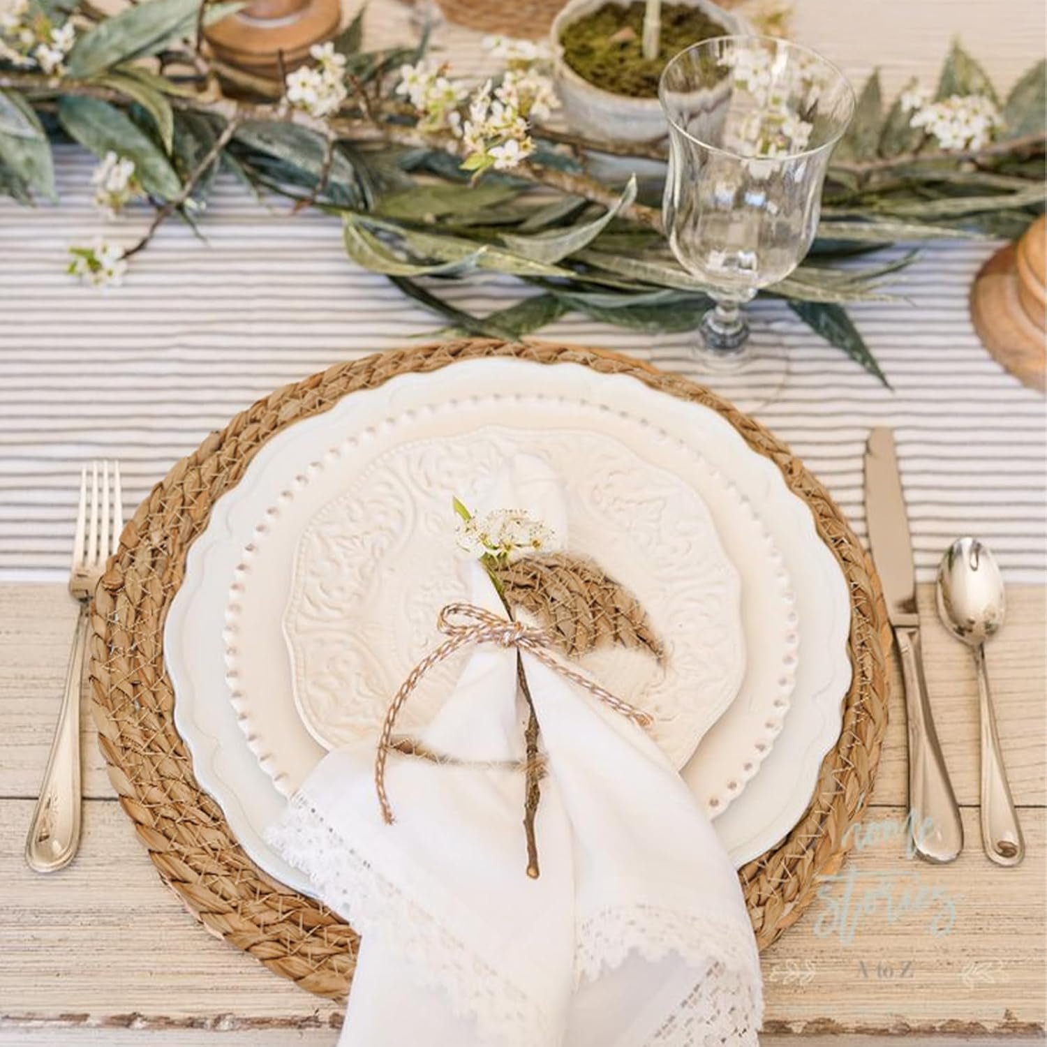 Boho hand-woven placemats are braided with 12 inch, 13 inch and 13.7 inch large rattan chargers for dinner plates.