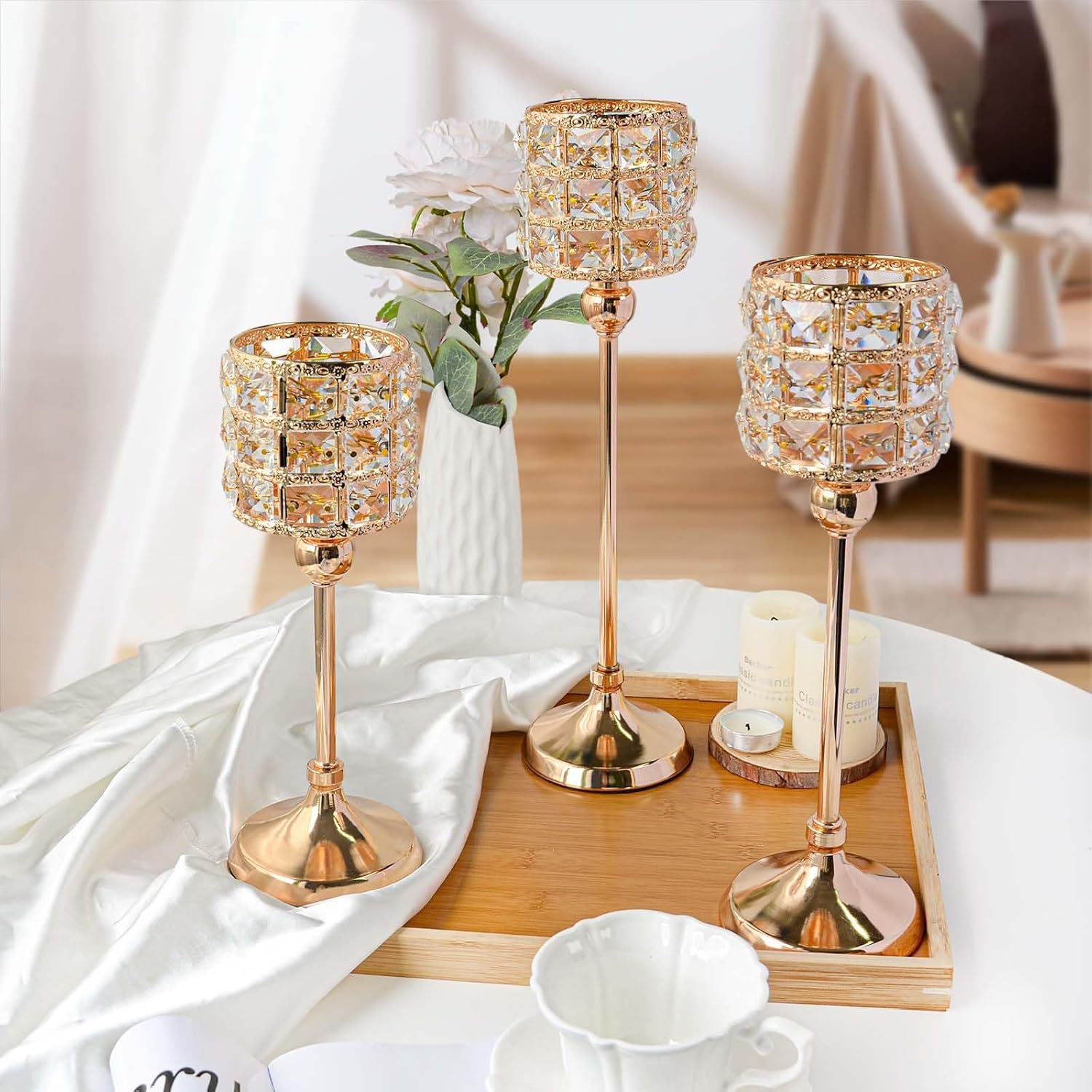 1[Beautiful&Elegant Crystal Candle Holder Set] — Pack of 3. Three heights: 11.22 inches and 13.11 inches and 15.15 inches. Fits candle sizes up to 2.36 inches in diameter.Those candlestick the perfect size for table centerpiece, and add romance and warmth to any occasion.(Candles not included)