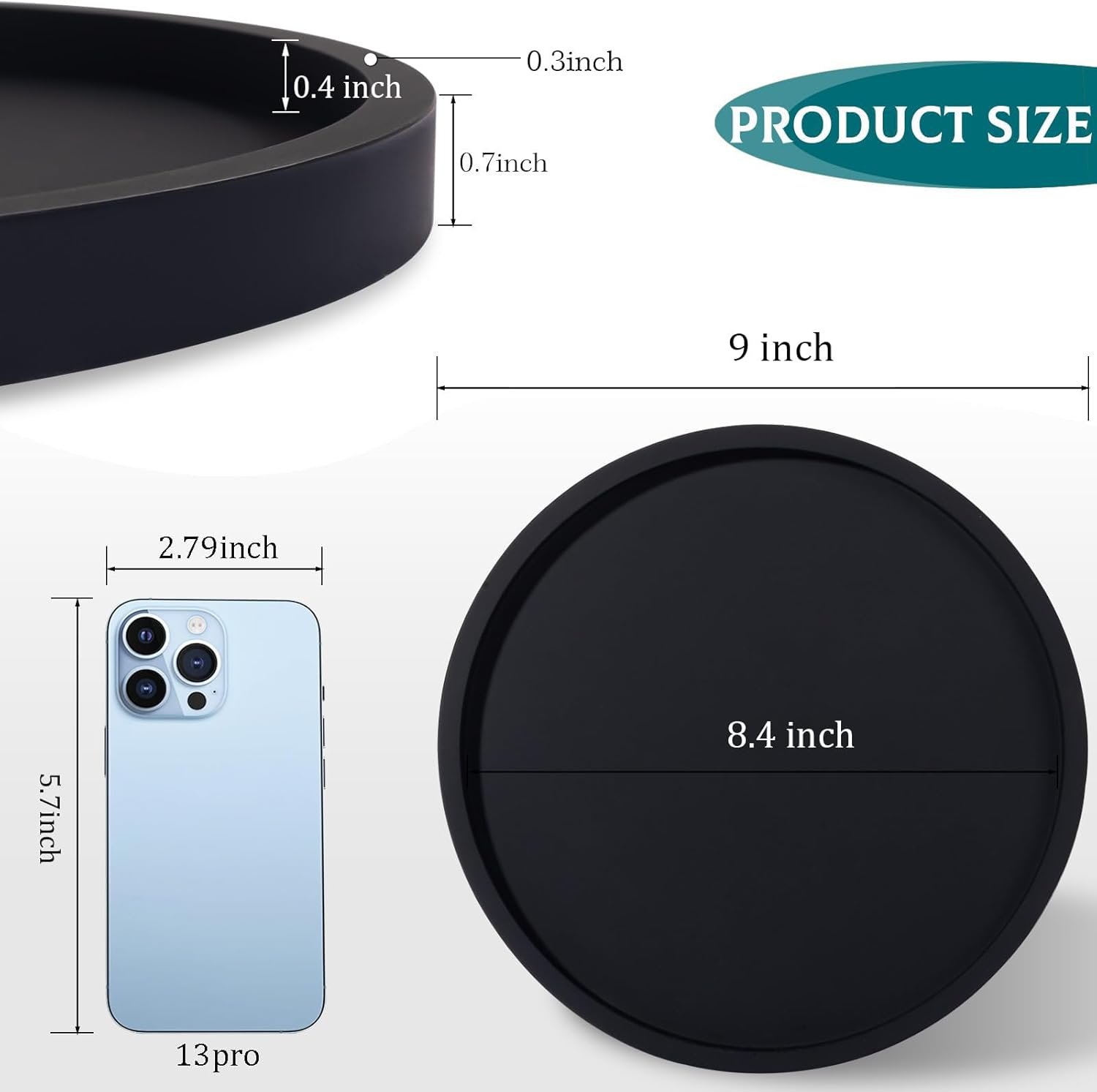 I bought the 9” tray to organize my canisters for Q-tips, cotton pads, and flossers. I definitely could’ve gone bigger, but this size still works well and keeps my bathroom counter tidy and stylish. The silicone is sturdy, non-slip, and easy to clean. Plus, the matte black look adds a sleek, modern vibe. Great value for a simple but effective organizer!