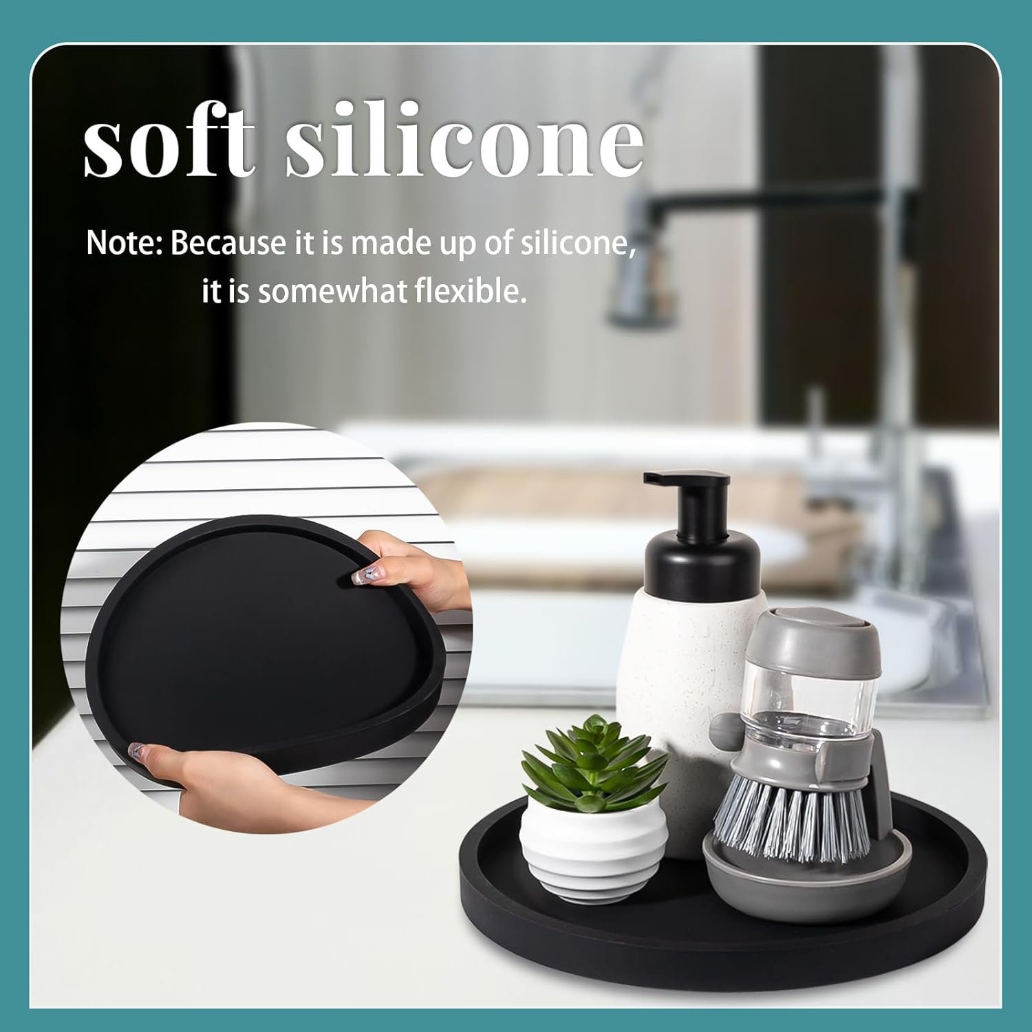 With a simple and modern design, the silicone tray is decorative, available in dark, marbled and coloured shades. Enhance the bathroom and kitchen decor.