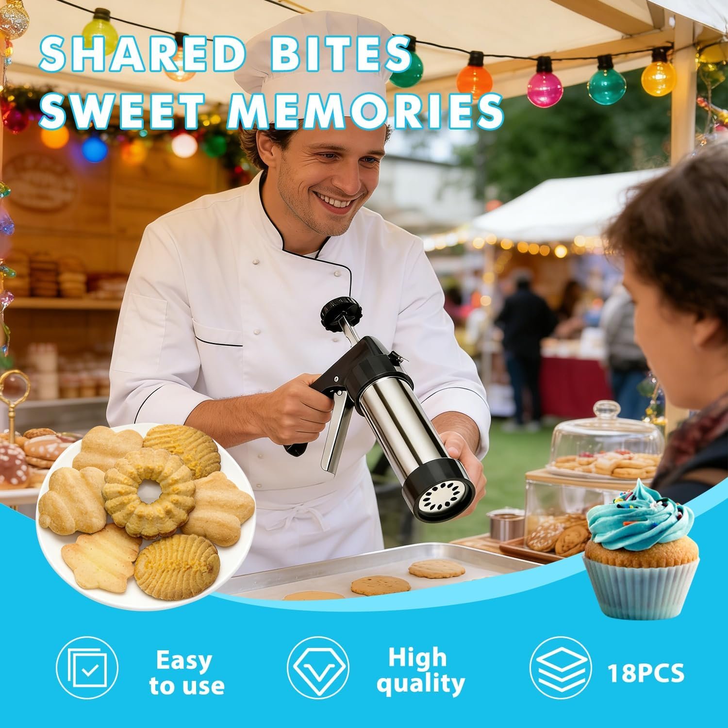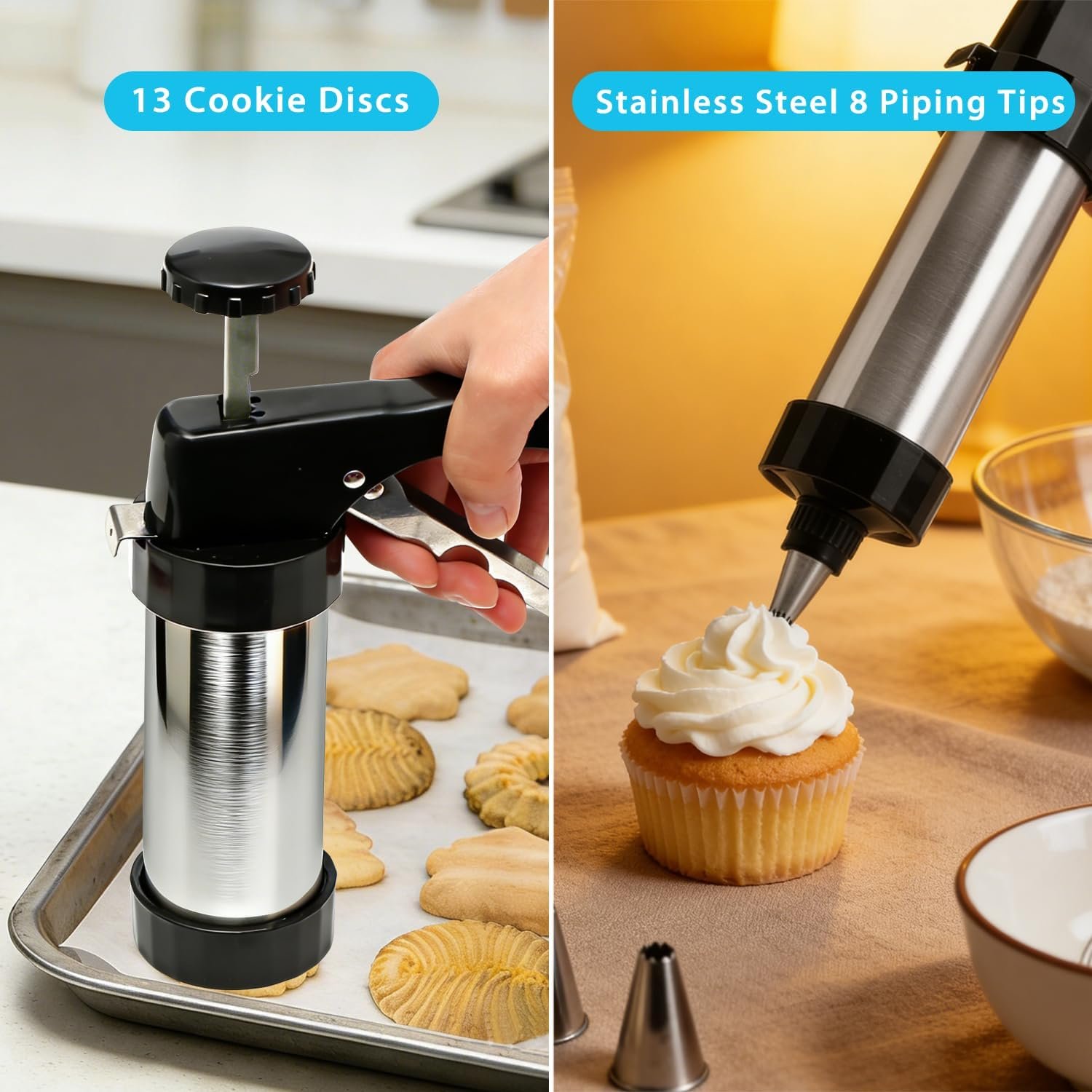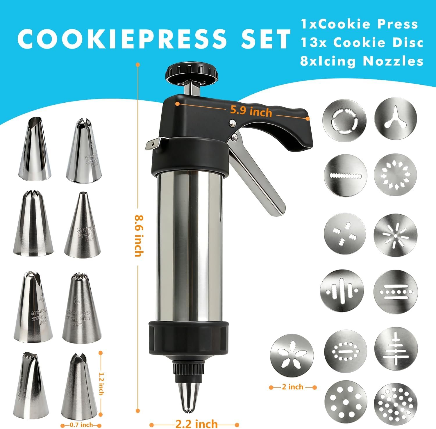I picked this cookie press up on a whim and ended up being really impressed with it. The stainless steel body feels sturdy and much more durable than the plastic ones I’ve used before. It’s simple to load with dough, and the handle is comfortable to press so you can make a whole batch pretty quickly.One of the best parts is the variety—you get 13 cookie discs and 8 piping tips, which makes it easy to create lots of different cookie shapes and even decorate other desserts. It’s a fun tool if you like experimenting with designs.Cleanup is also straightforward since the pieces come apart easily and the stainless steel wipes clean without much effort.Overall, it’s a great baking tool for making spritz cookies or decorating treats. If you enjoy baking or want something fun to use with family during the holidays, this is definitely a great buy.
