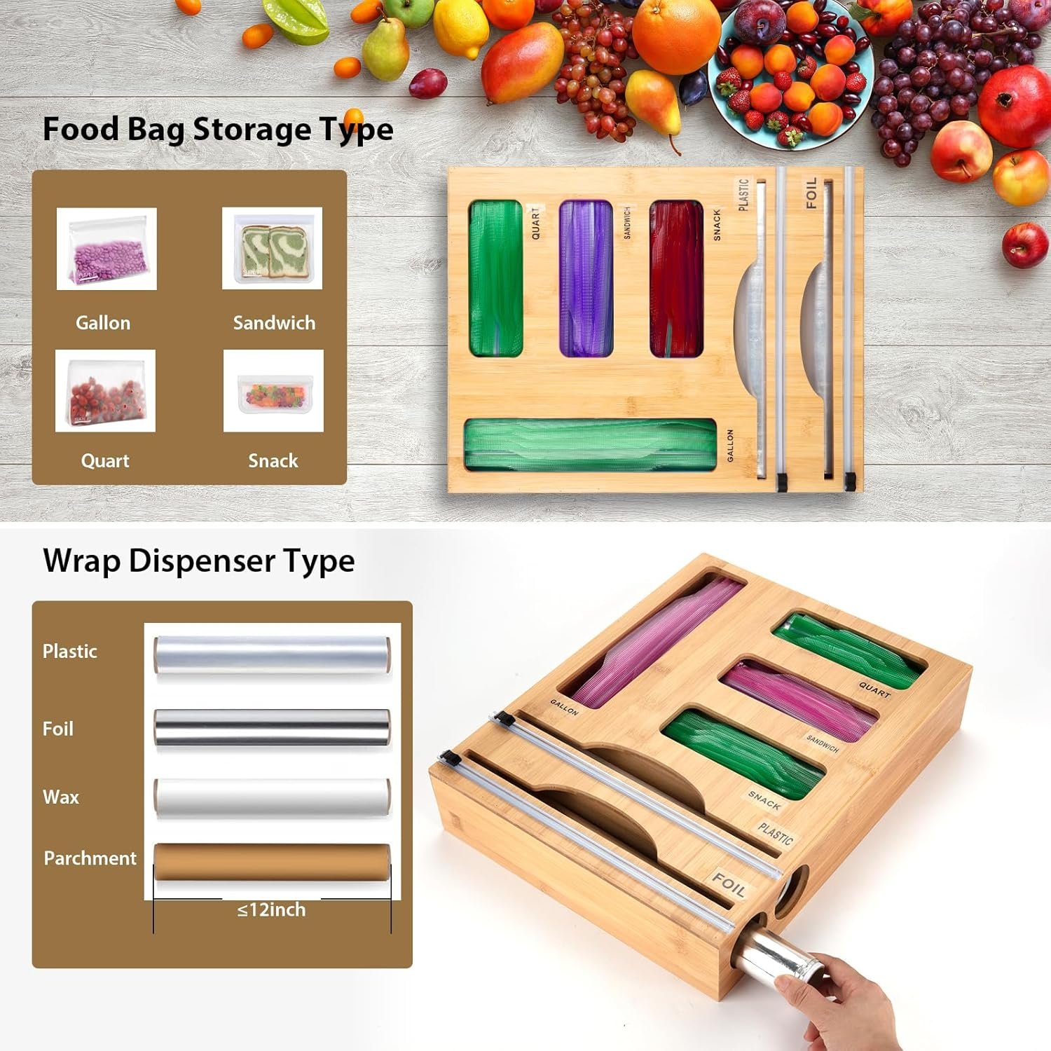 Premium Material: Made of 100% natural material, this bag organizer with plastic wrap dispenser is very sturdy. In addition, the polished surface not only won’t hurt your hands, but also easy to clean and maintain
