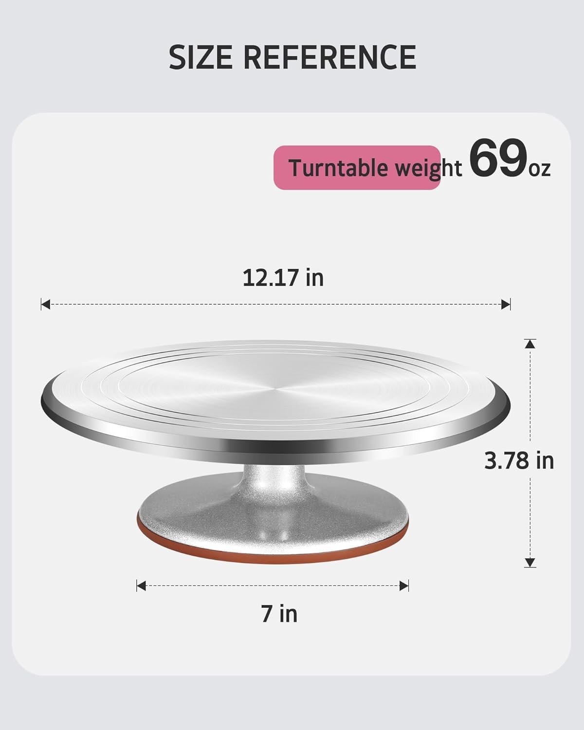 As a home baker who decorates cakes as a hobby, I couldn’t be happier with this cake turner! It’s incredibly lightweight, yet you can tell it’s made from high-quality materials that will last. The smooth spinning action makes it so easy to achieve even layers and flawless decorations. Plus, the rubber anti-slip bottom is fantastic—it keeps the turner securely in place, so I can focus entirely on my decorating. It truly makes the whole process a breeze, and I find myself enjoying it even more now. Whether you’re new to cake decorating or have been doing it for a while, this turner is a must-have. Highly recommend!