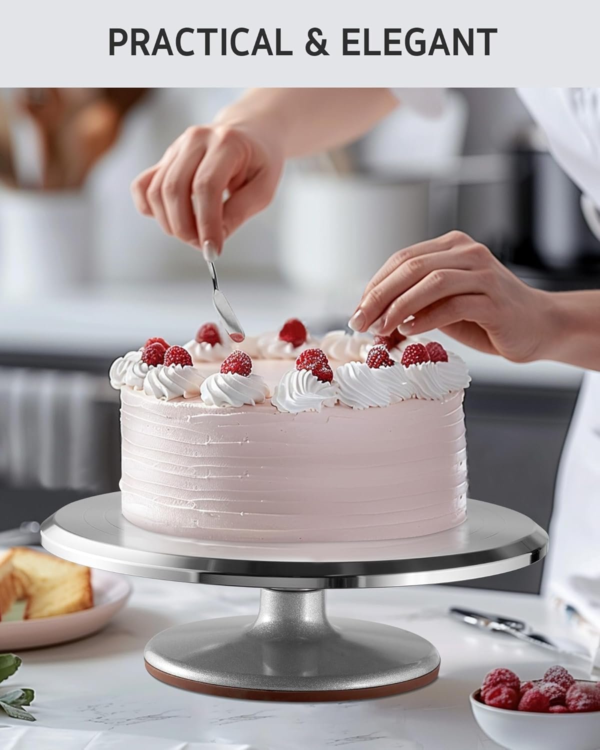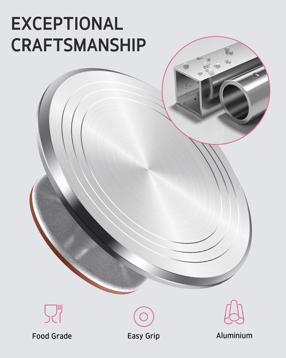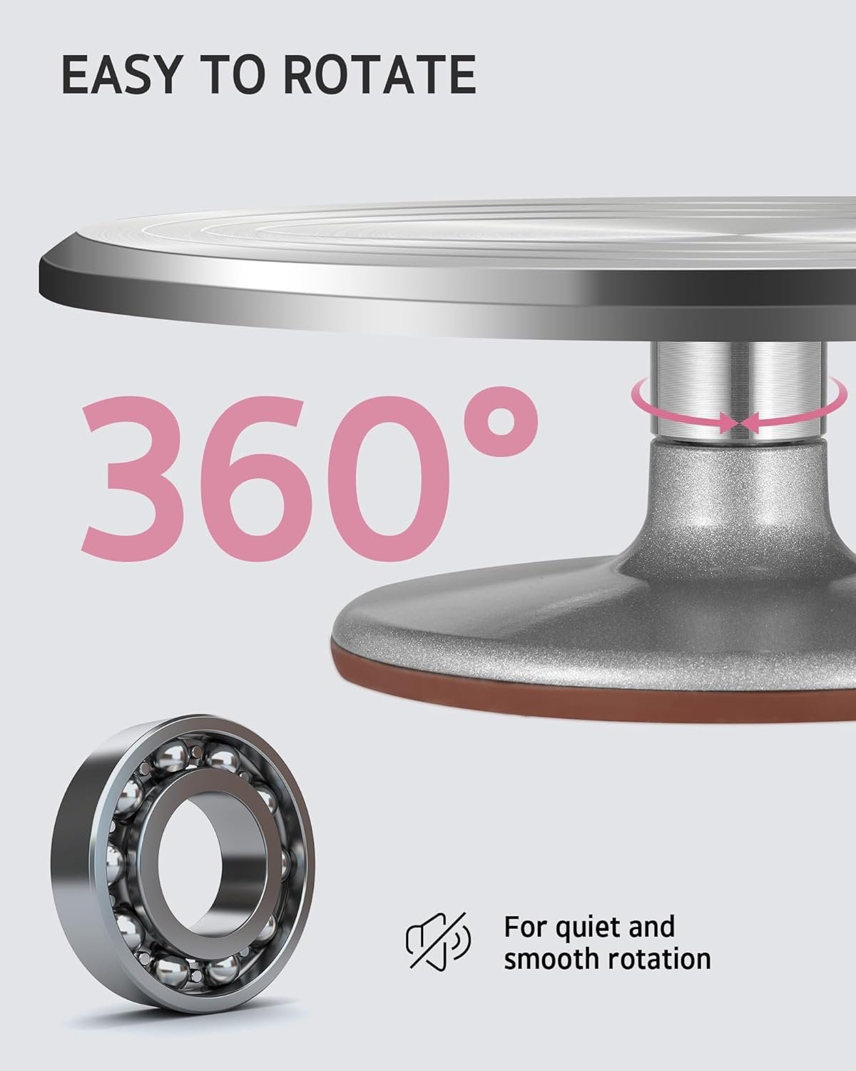 The stand rotates with high-end stainless steel ball bearings, which results in a super smooth and steady rotation, this makes cake decorating easier.