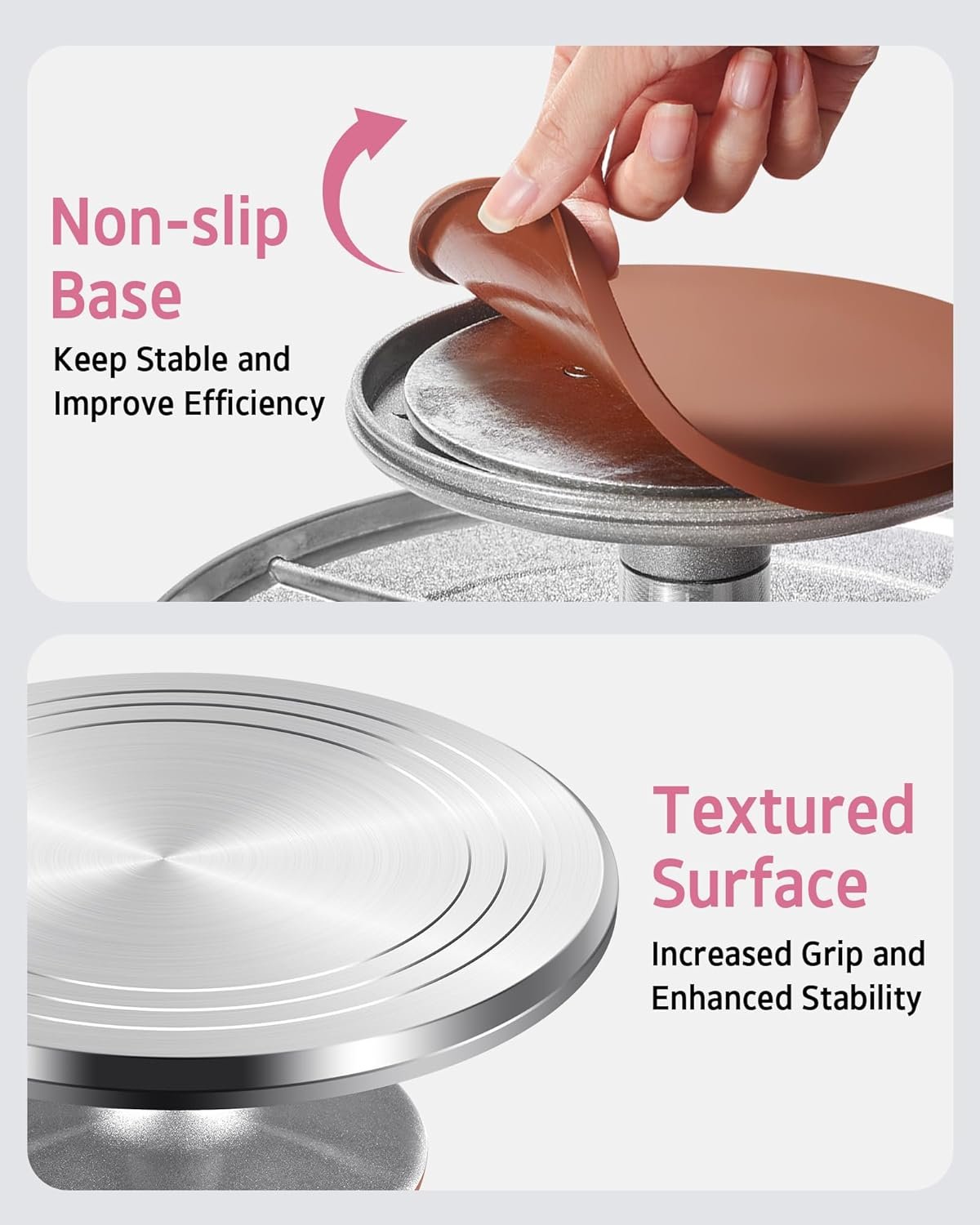 Non-slip Top and Base: The top plate has a non-slip surface which can keep the cake firmly in place as you work. The bottom comes with a soft silicone pad that secures the cake spinner stand to your countertop, providing strong stability while decorating and protecting the table from scratches.