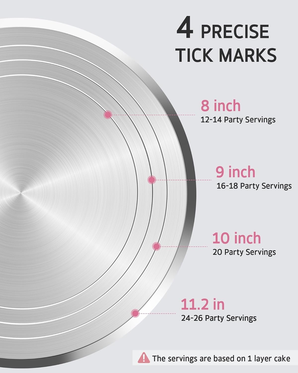 Well-Made Cake Turntable: Syntus revolving cake turntable is made of durable aluminum and weighs 4.3 lb, making it strong enough to hold even a heavy or large cake without tipping over. Etched concentric circles on the top platter which measure 8″/9″/10″/11.2″, make it easier to clarify the size of cake and center what you are decorating.