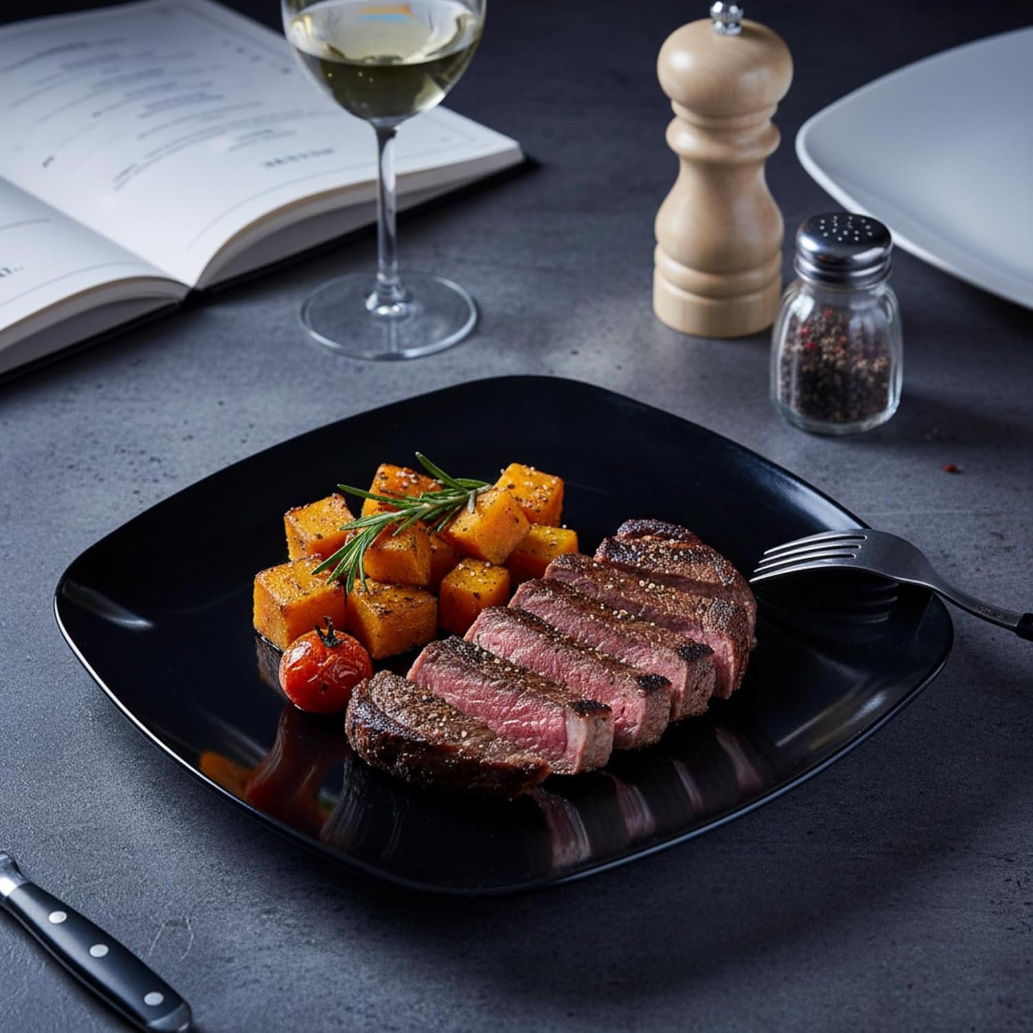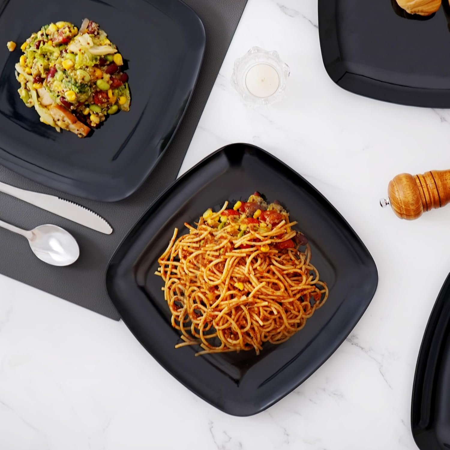 Classic Square Design: Our 10.5-inch melamine dinner plates feature a classic square shape with curved edges, perfect for serving pasta, salad, steak, snacks, and pizza. The sleek black design complements any kitchen décor, making it an ideal choice for both modern and vintage table settings.