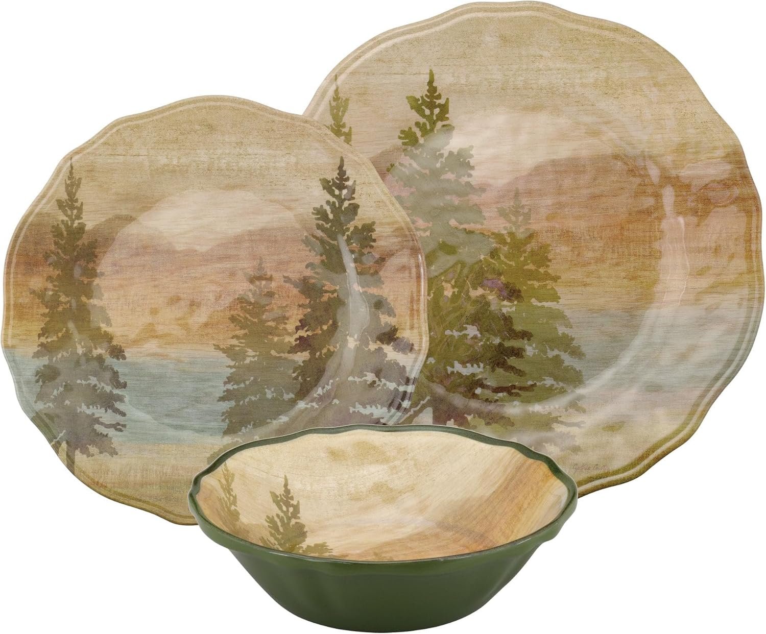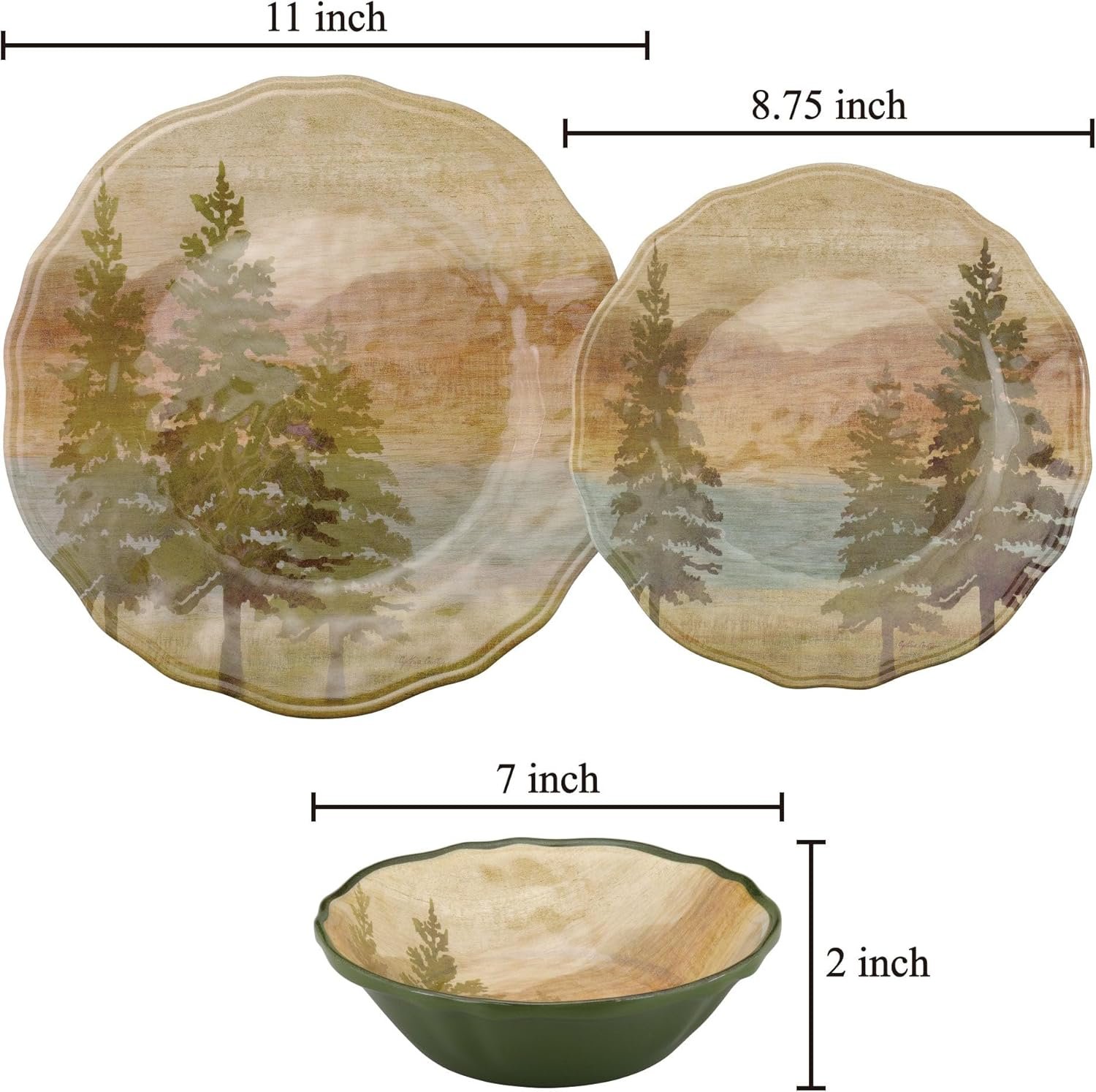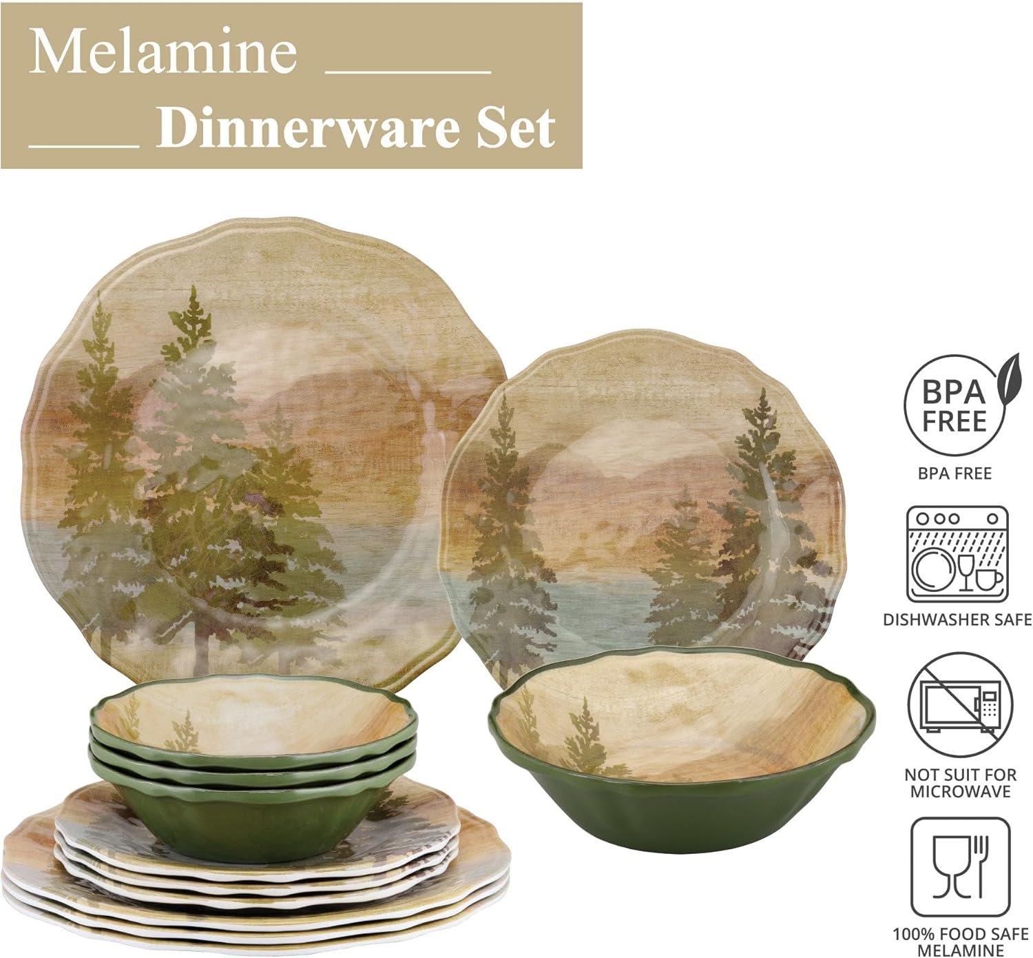 UPware 12 Piece Lakeside Pine Melamine Dinnerware Sets, Outdoor Dishes Set, Plates and Bowls Sets, Service for 4, Beige