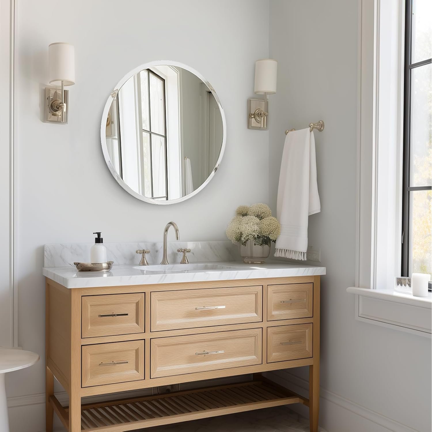 13 reviews for USHOWER Frameless Round Bathroom Mirror 24″, Circle Vanity Mirror for Wall Decor, with Beveled Edge, for Bathroom, Living Room, Entryway, Modern & Elegant Look