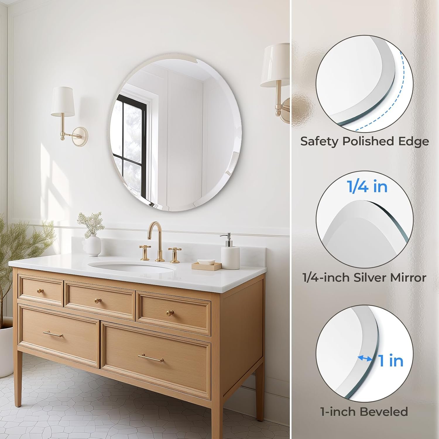 Safe Packaging: USHOWER circle bathroom mirror passes drop and impact tests, with sturdy packaging to ensure your round beveled mirror arrives safely and in pristine condition. Warm tip: Due to beveled edges and polishing, mirror size may deviate by up to 1/4 in