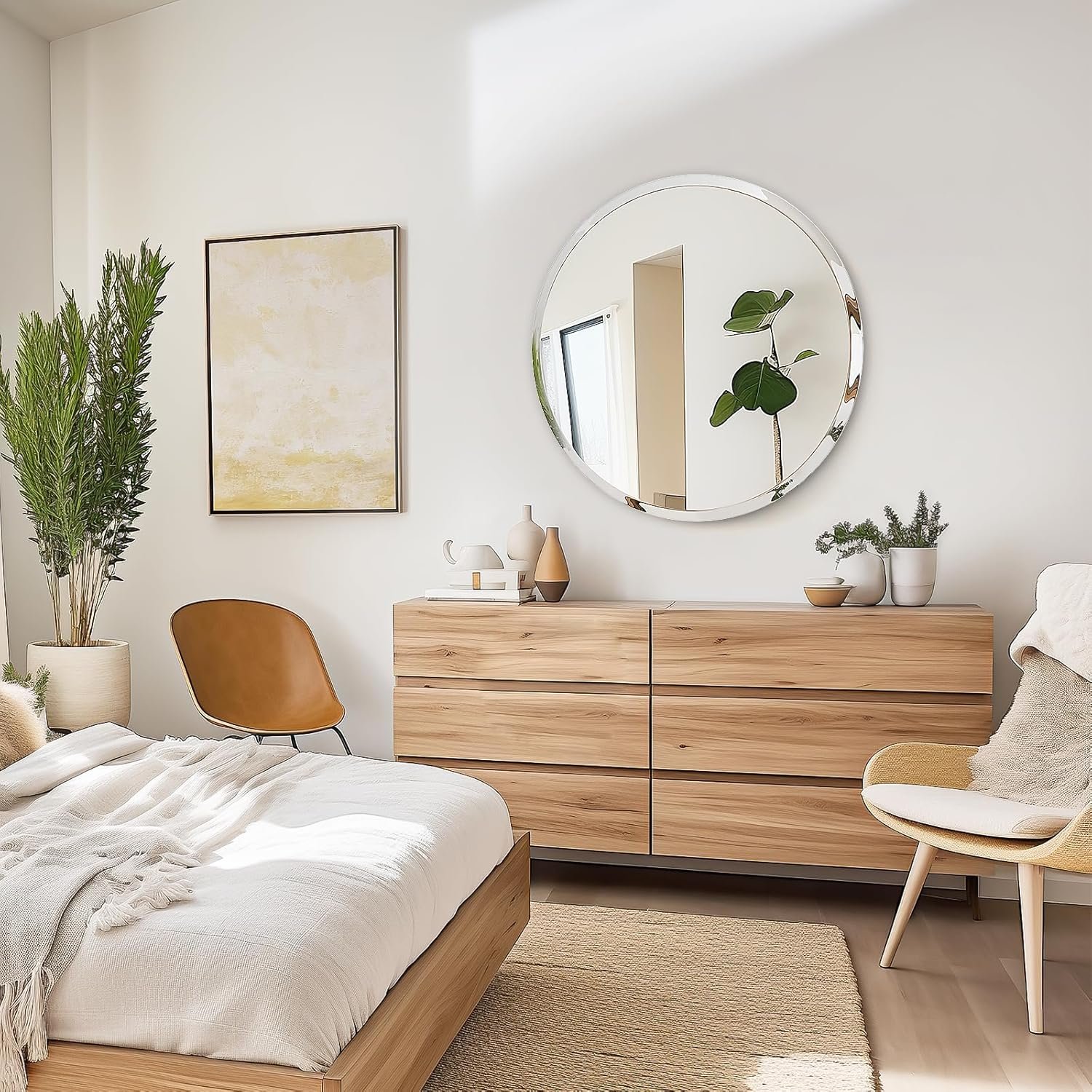 Modern Design: Classic frameless round mirror offers pure visual pleasure, creates a sense of openness. Polished beveled edge adds elegant style to your bathroom or living room, shows your unique taste and personality