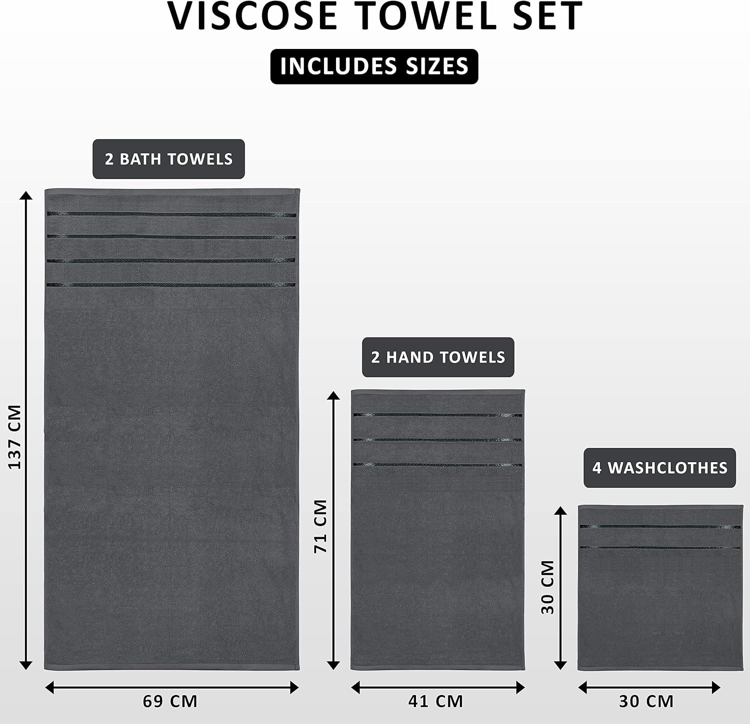 Set of 8 Towels – Includes 2 bath towels, each measuring 27 x 54 inch; 2 hand towels, each measuring 16 x 28 inch and 4 washcloths, each measuring 12 x 12 inch