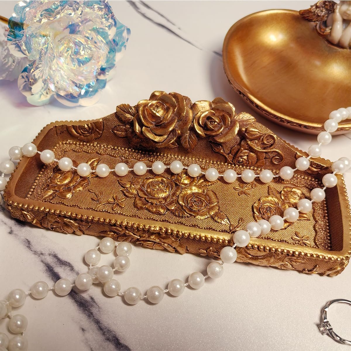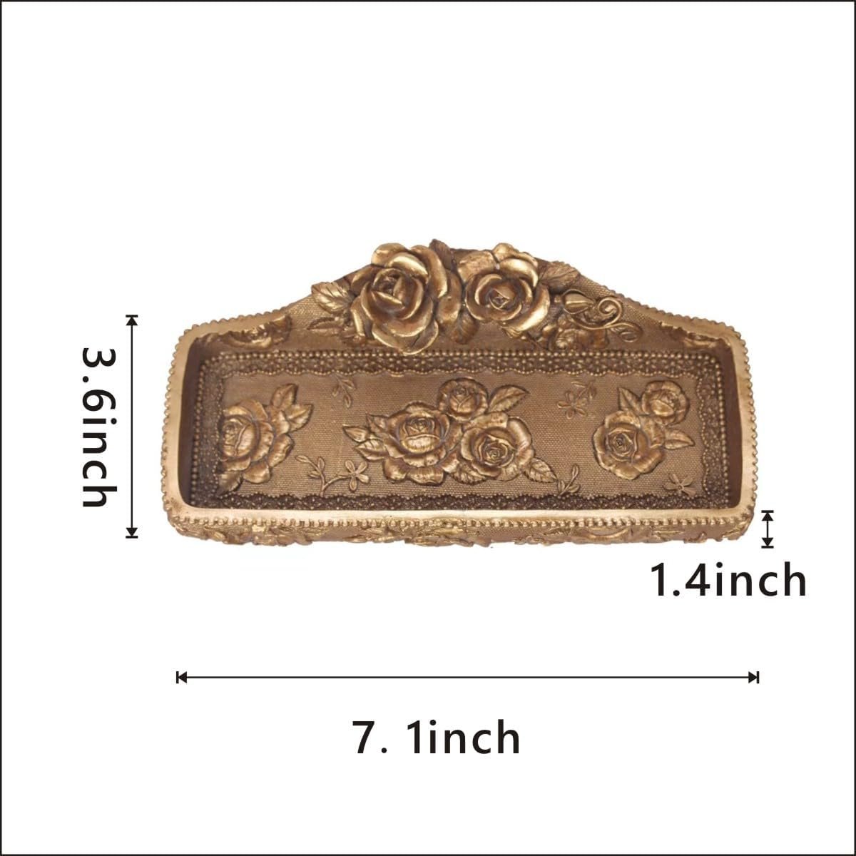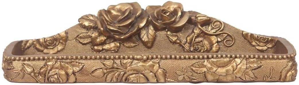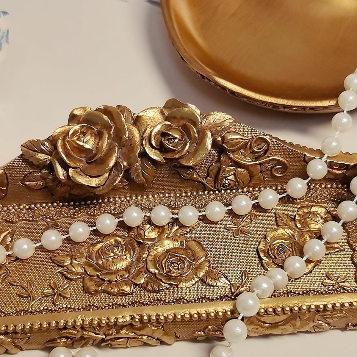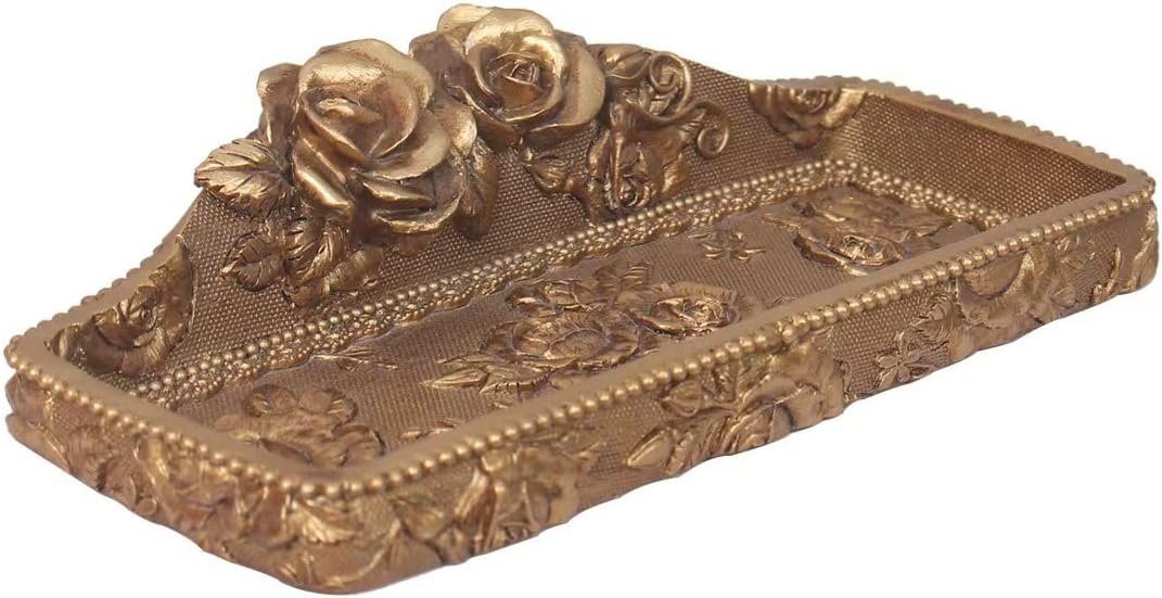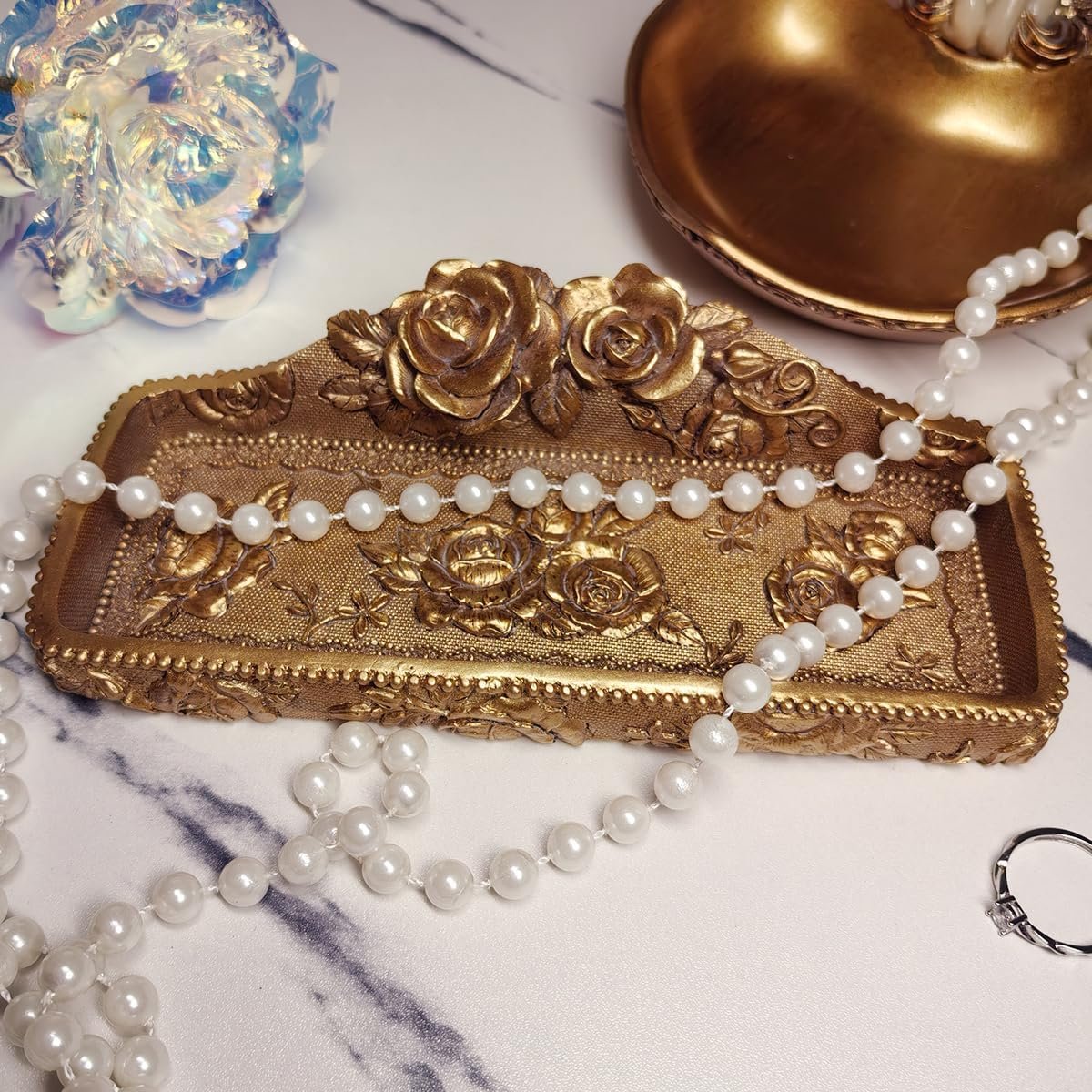 Exquisite Appearance:This tray is rectangular with a slightly curved top edge. It is richly decorated with detailed rose patterns, including both large, prominent roses at the top and smaller rose motifs along the surface. The edges are adorned with intricate bead – like and scroll designs, giving it a three – dimensional and ornate look. The tray has a warm, golden hue, resembling antique brass or a gilded finish. This color enhances the vintage aesthetic and gives the tray a sense of richness and heritage.