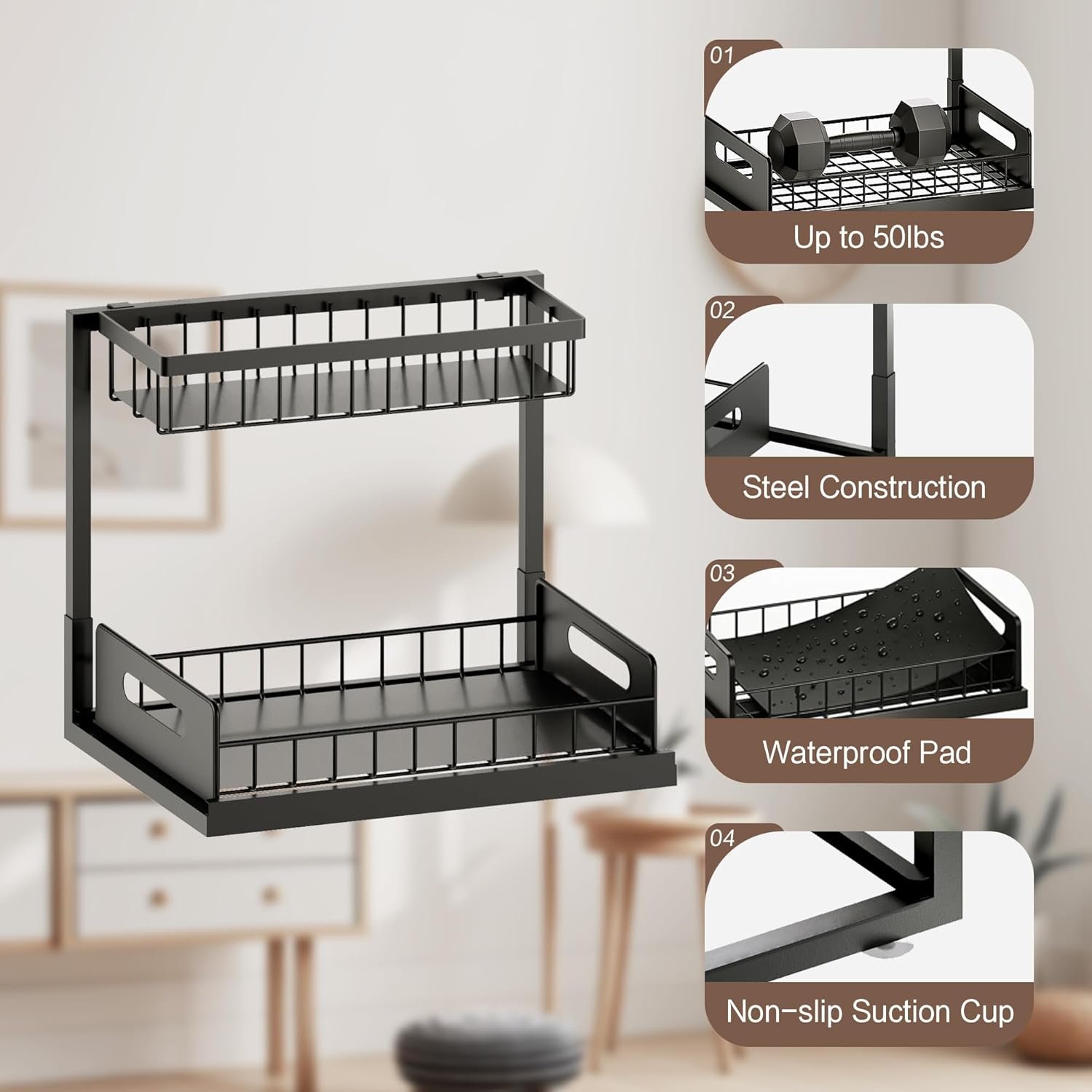 Sturdy & Stable 2-Tier Organizer: This under the sink organizer is made of high quality steel, which can hold up to 50lbs. It comes with 4 suction cups on the base to fix its position and prevent items from slipping out
