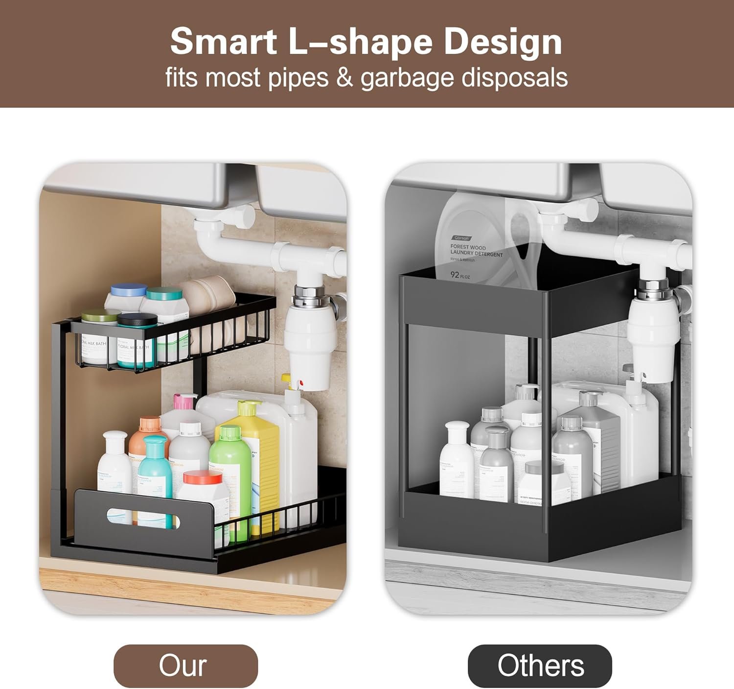 L Shape Design: L-shape design fits sink cabinet corners. The narrow top and wide bottom maximize vertical space, solving storage issues for your under kitchen sink organizer or under bathroom sink organizer