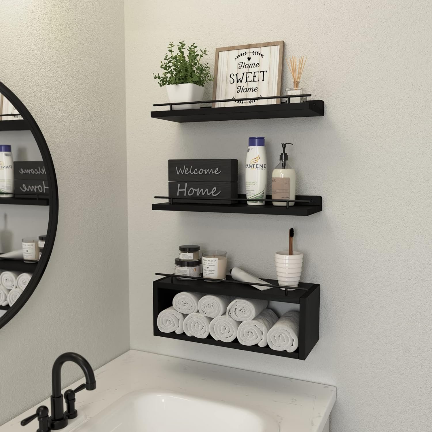 WOPITUES Floating Shelves for Wall with Cube Shelf, Wall Shelves with Metal Rail for Bathroom Decor, Bathroom Organizers and Storage, Over Toilet Shelves for Toilet Paper-Black
